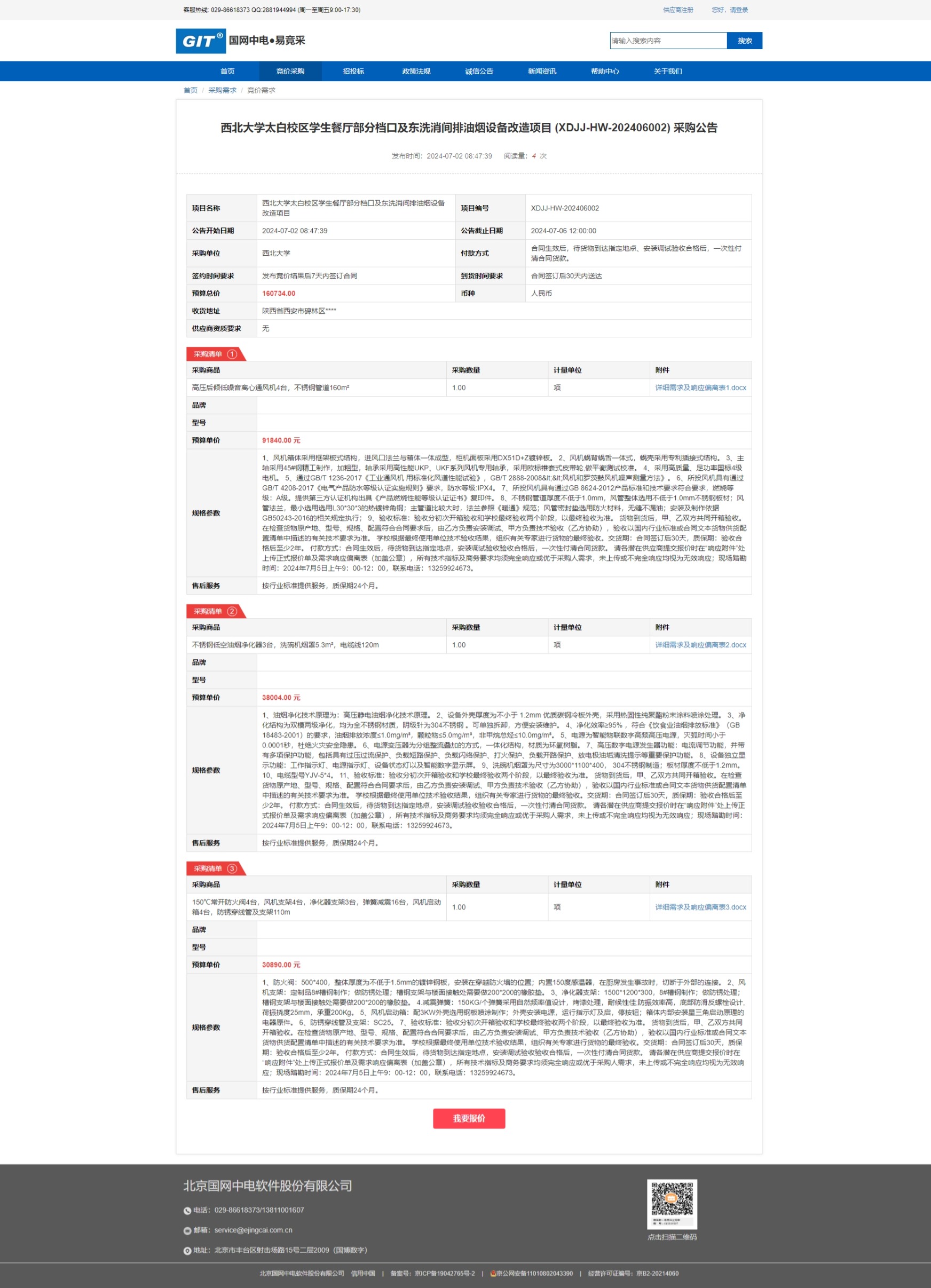 广发体育太白校区学生餐厅部分档口及东洗消间排油烟设备改造项目 (XDJJ-HW-202406002) 竞价采购公告 作者: 编辑:采购与招标办公室 时间:2024-07-02 原公告链接:https://www.ejingcai.com.cn/site/bidding/detail/11377