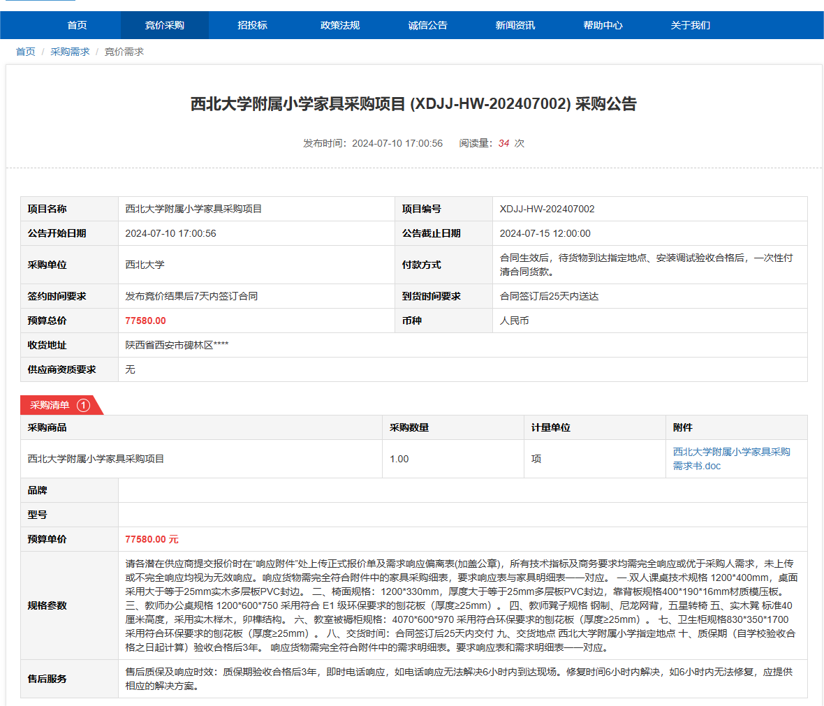 广发体育附属小学家具采购项目 (XDJJ-HW-202407002) 竞价采购公告 作者: 编辑: 时间:2024-07-11 原公告链接:https://www.ejingcai.com.cn/site/bidding/detail/11607