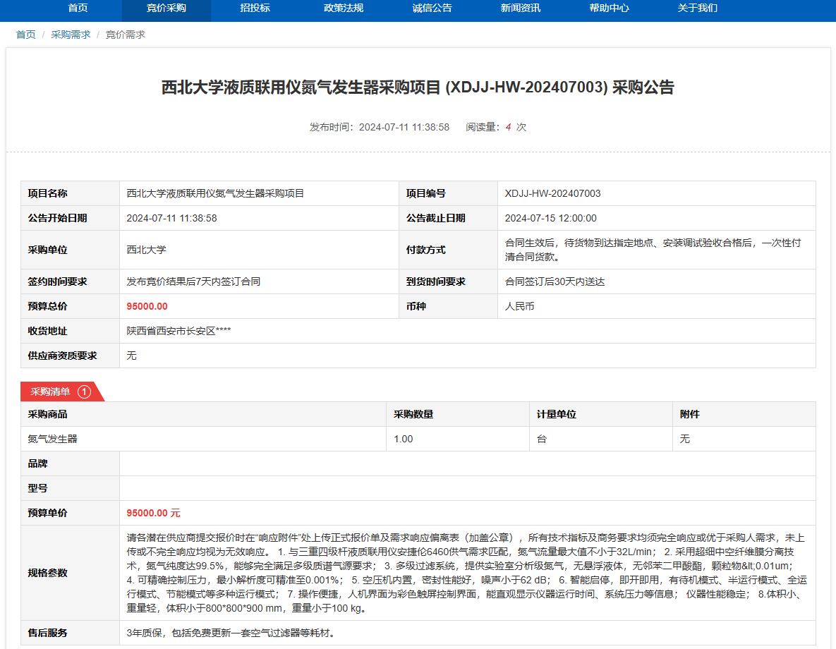 广发体育液质联用仪氮气发生器采购项目 (XDJJ-HW-202407003) 竞价采购公告 作者: 编辑: 时间:2024-07-11 原公告链接:https://www.ejingcai.com.cn/site/bidding/detail/11611