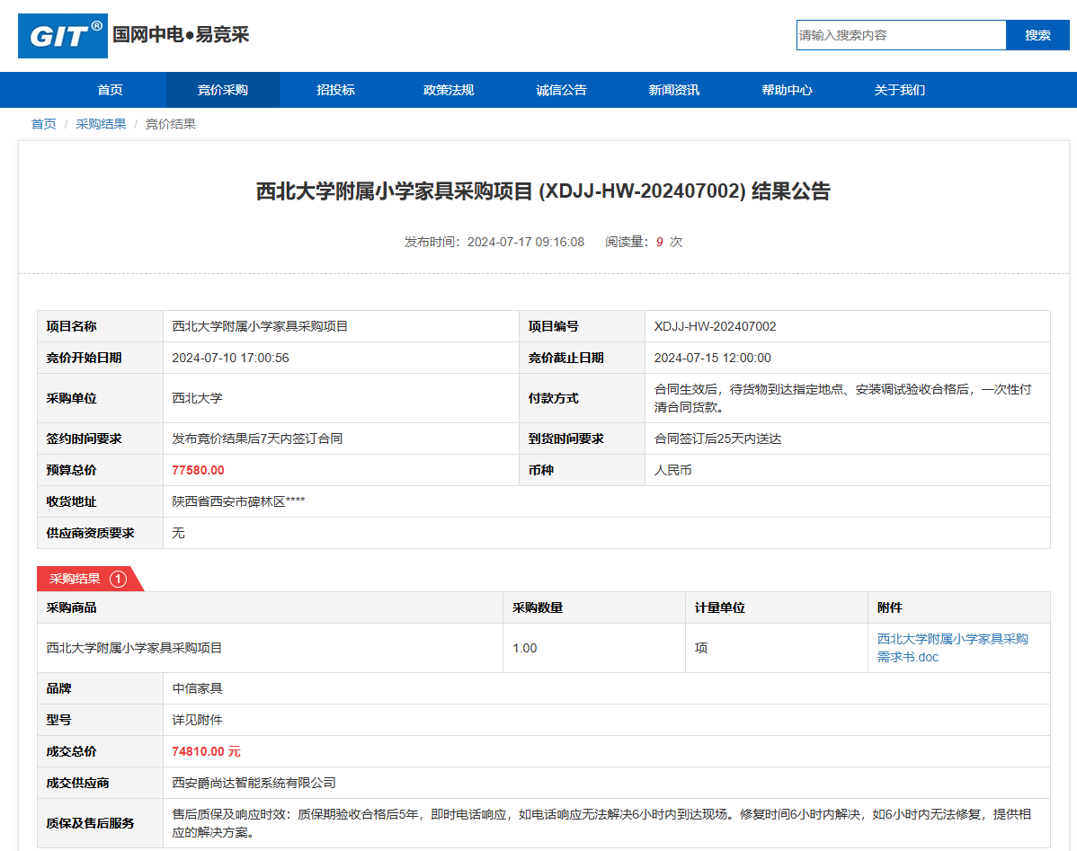 广发体育附属小学家具采购项目 (XDJJ-HW-202407002) 竞价结果公告 作者: 编辑: 时间:2024-07-17 原公告链接:https://www.ejingcai.com.cn/site/bidding/detail/11713