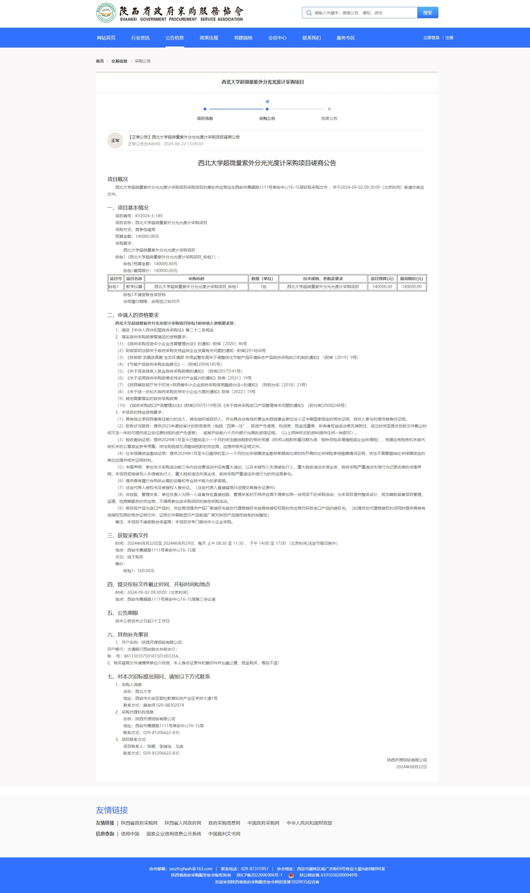 广发体育超微量紫外分光光度计采购项目磋商公告 作者: 编辑:采购与招标办公室 时间:2024-08-23 原公告链接:https://www.sxszfcgfwxh.cn/#/tender-vTradeAnnouncement-anno?tenderProjectId=1826435442958446594&rootId=1549250743389216770