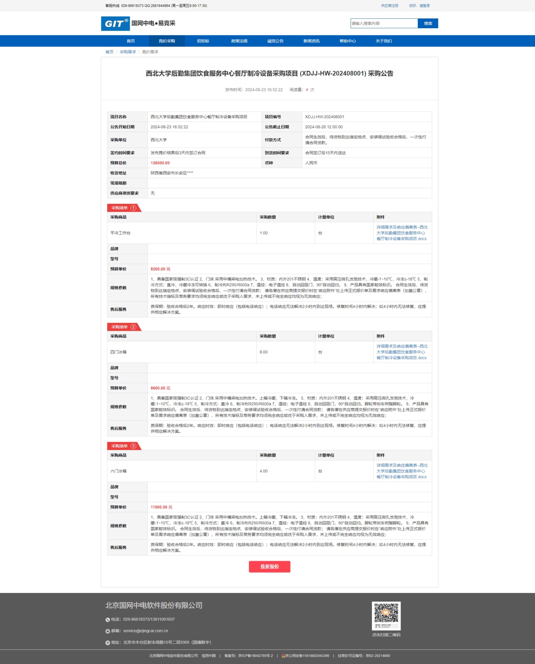 广发体育后勤集团饮食服务中心餐厅制冷设备采购项目 (XDJJ-HW-202408001) 竞价公告 作者: 编辑:采购与招标办公室 时间:2024-08-23 原公告链接:https://www.ejingcai.com.cn/site/bidding/detail/12189