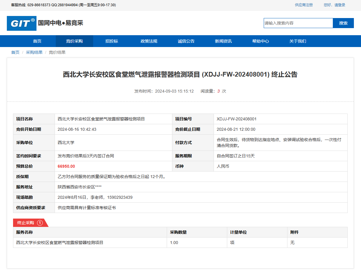 广发体育长安校区食堂燃气泄露报警器检测项目 (XDJJ-FW-202408001) 竞价终止公告 作者: 编辑: 时间:2024-09-03 原公告链接:https://www.ejingcai.com.cn/site/bidding/detail/12307