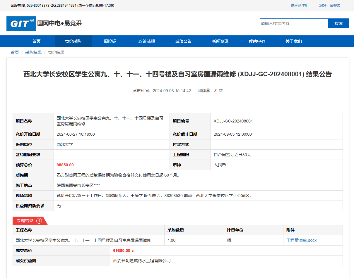 广发体育长安校区学生公寓九、十、十一、十四号楼及自习室房屋漏雨维修 (XDJJ-GC-202408001) 竞价结果公告 作者: 编辑: 时间:2024-09-03 原公告链接:https://www.ejingcai.com.cn/site/bidding/detail/12306