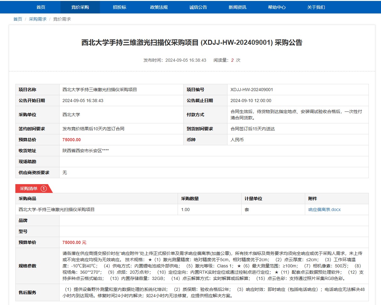 广发体育手持三维激光扫描仪采购项目 (XDJJ-HW-202409001) 竞价采购公告 作者: 编辑: 时间:2024-09-05 原公告链接:https://www.ejingcai.com.cn/site/bidding/detail/12357