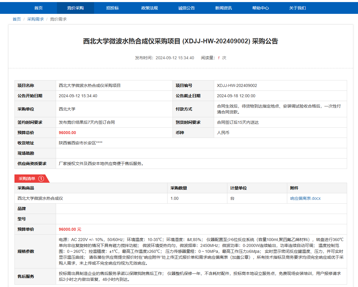 广发体育微波水热合成仪采购项目 (XDJJ-HW-202409002)竞价采购公告 作者: 编辑: 时间:2024-09-12 原公告链接:https://www.ejingcai.com.cn/site/bidding/detail/12527