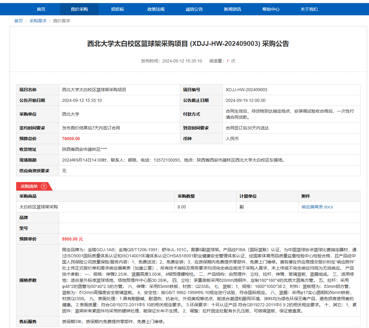 广发体育太白校区篮球架采购项目 (XDJJ-HW-202409003)竞价采购公告 作者: 编辑: 时间:2024-09-12 原公告链接:https://www.ejingcai.com.cn/site/bidding/detail/12528
