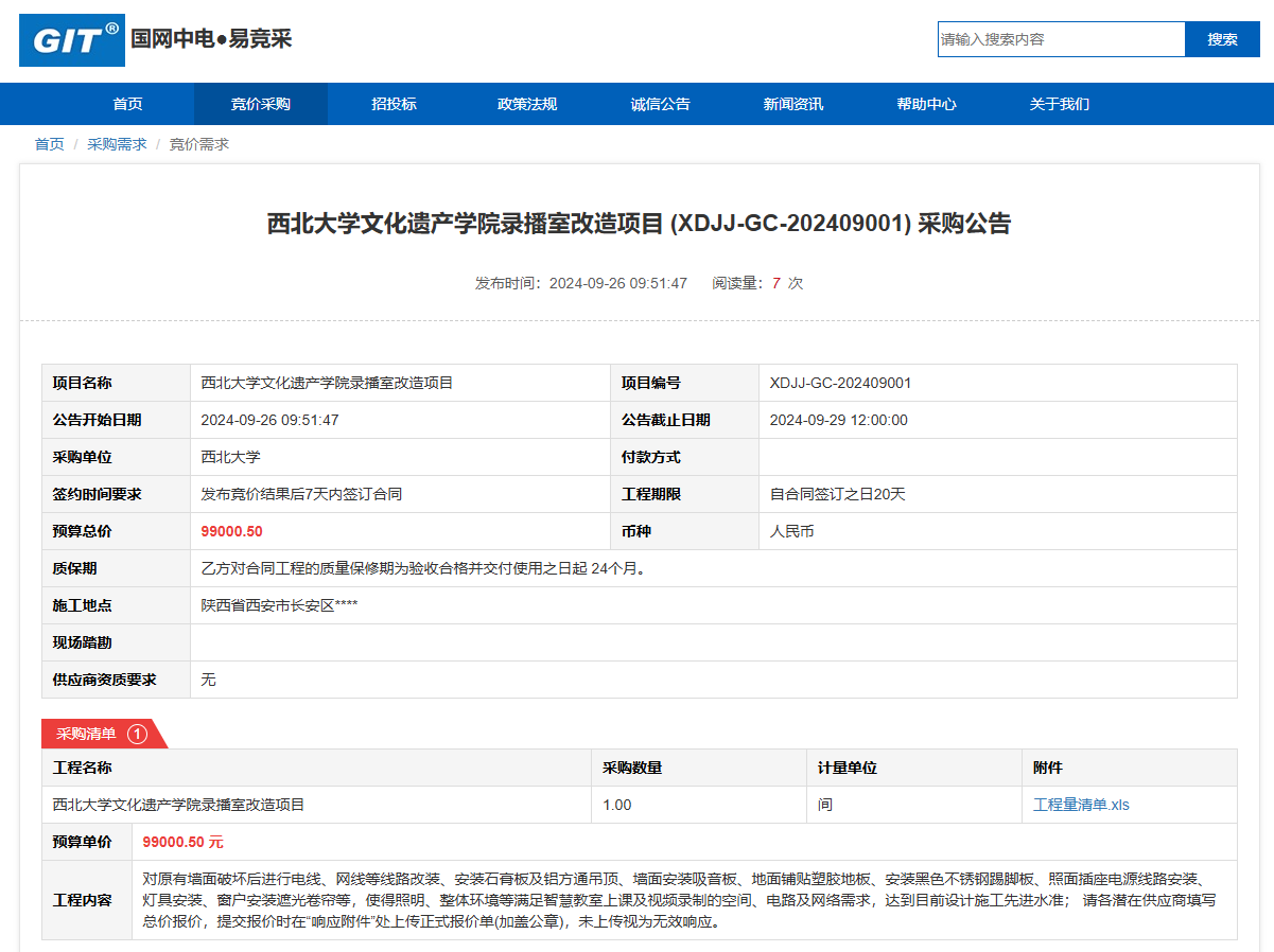 广发体育文化遗产学院录播室改造项目 (XDJJ-GC-202409001)竞价采购公告 作者: 编辑: 时间:2024-09-26 原公告链接:https://www.ejingcai.com.cn/site/bidding/detail/12907