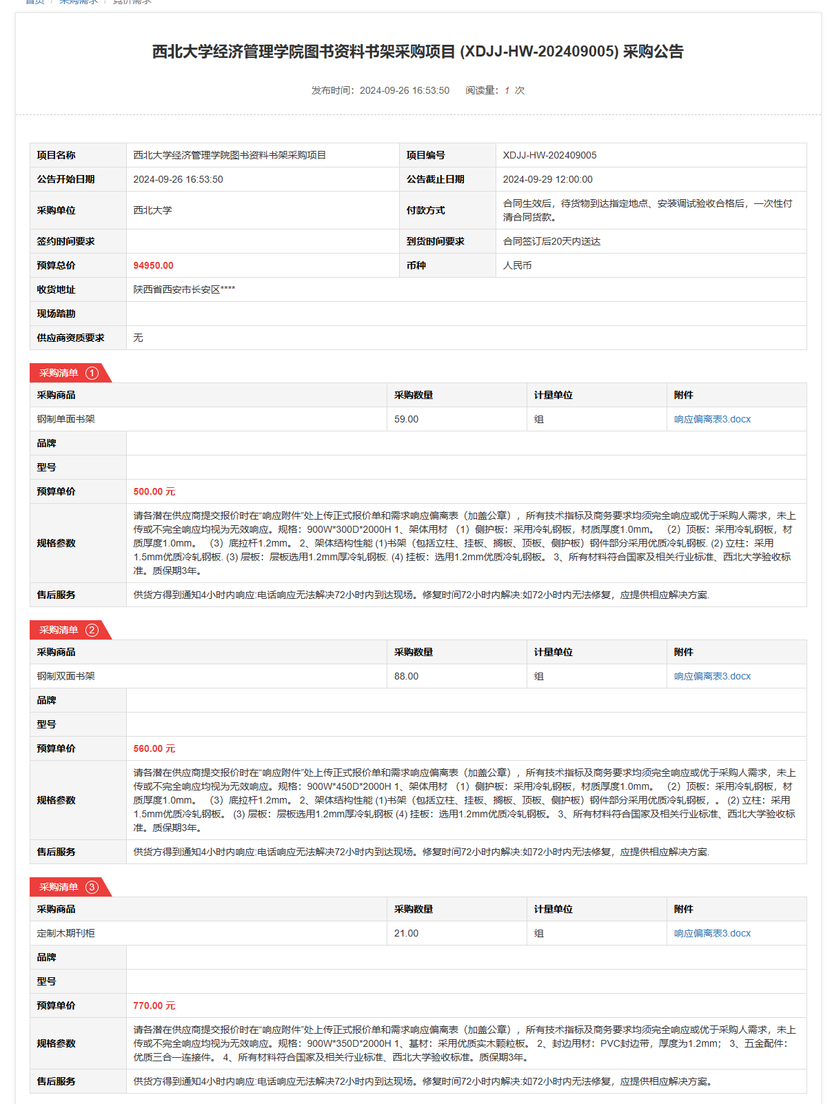 广发体育经济管理学院图书资料书架采购项目(XDJJ-HW-202409005)竞价采购公告 作者: 编辑: 时间:2024-09-26 原公告链接:https://www.ejingcai.com.cn/site/bidding/detail/12910
