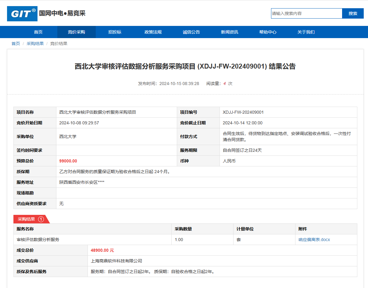 广发体育审核评估数据分析服务采购项目(XDJJ-FW-202409001)竞价结果公告 作者:采购与招标办公室 编辑: 时间:2024-10-15 原公告链接:https://www.ejingcai.com.cn/site/bidding/detail/13296