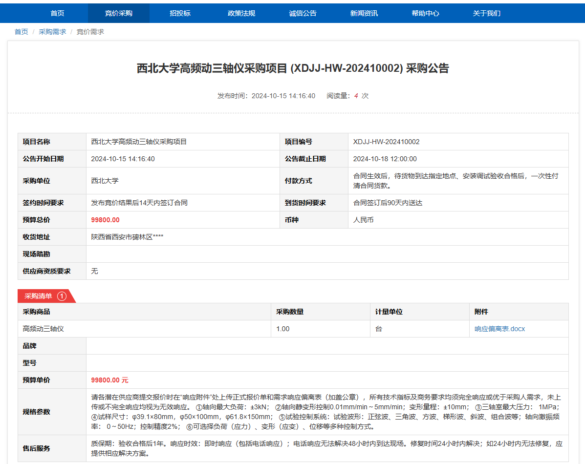 广发体育高频动三轴仪采购项目(XDJJ-HW-202410002)竞价采购公告 作者:采购与招标办公室 编辑: 时间:2024-10-15 原公告链接:https://www.ejingcai.com.cn/site/bidding/detail/13317