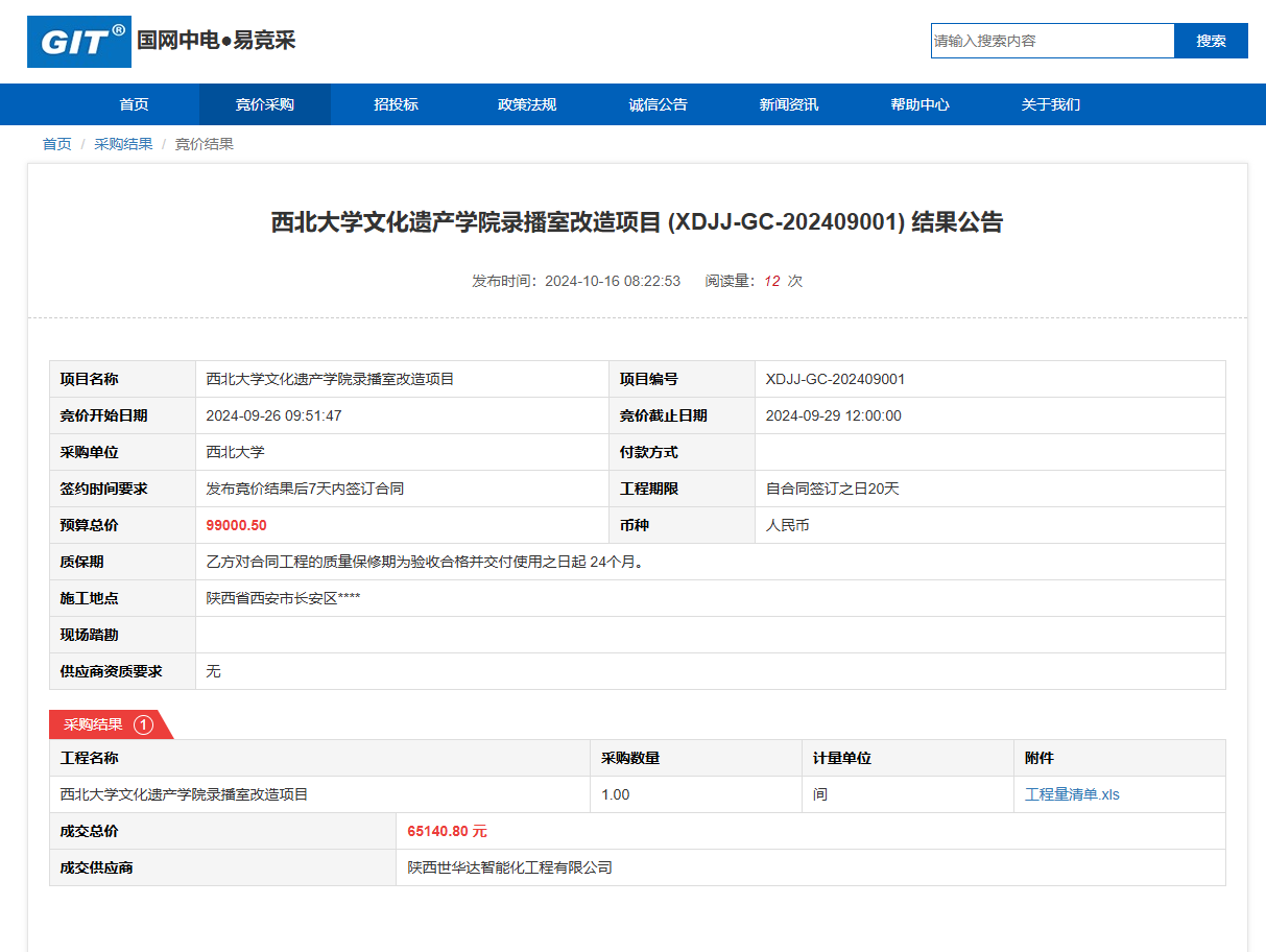 广发体育文化遗产学院录播室改造项目(XDJJ-GC-202409001)竞价结果公告 作者:采购与招标办公室 编辑: 时间:2024-10-16 原公告链接:https://www.ejingcai.com.cn/site/bidding/detail/13343