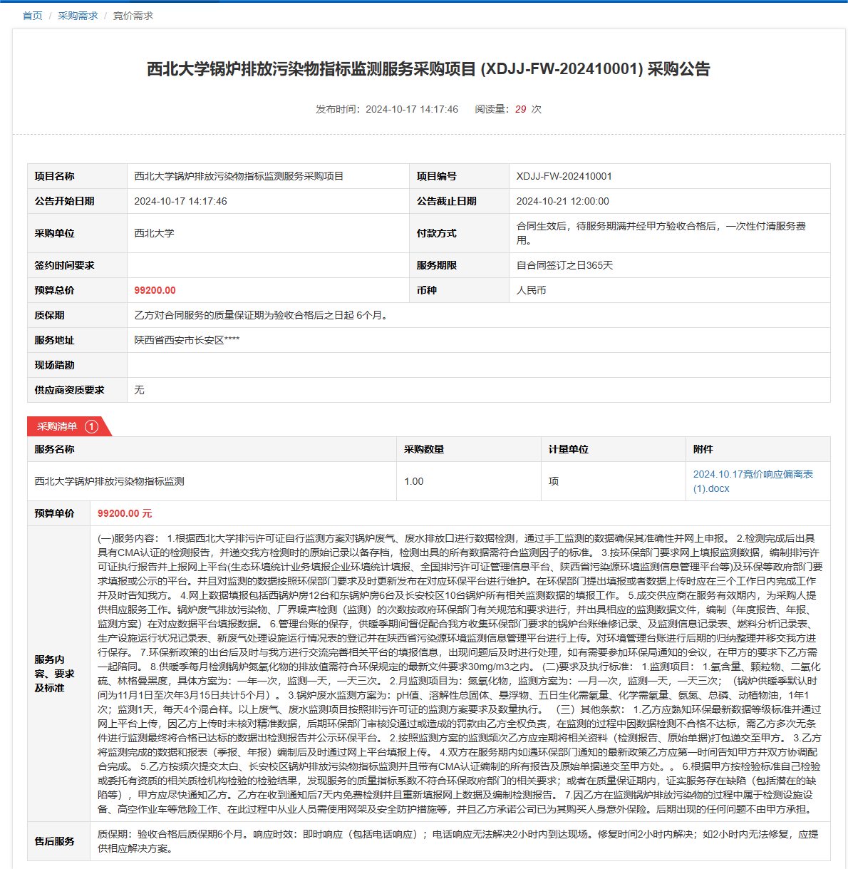 广发体育锅炉排放污染物指标监测服务采购项目(XDJJ-FW-202410001)竞价采购公告 作者:采购与招标办公室 编辑: 时间:2024-10-18 原公告链接:https://www.ejingcai.com.cn/site/bidding/detail/13425