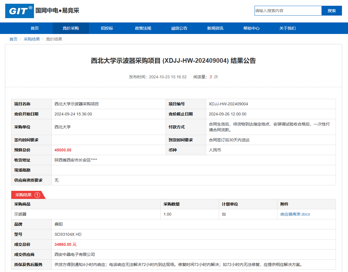 广发体育示波器采购项目(XDJJ-HW-202409004)竞价结果公告 作者:采购与招标办公室 编辑: 时间:2024-10-23 原公告链接:https://www.ejingcai.com.cn/site/bidding/detail/13693