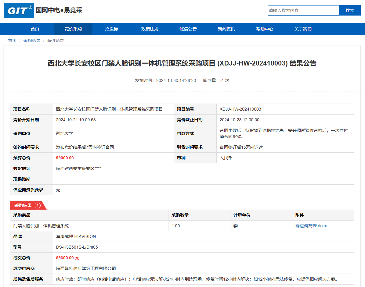 广发体育长安校区门禁人脸识别一体机管理系统采购项目(XDJJ-HW-202410003)竞价结果公告 作者:采购与招标办公室 编辑: 时间:2024-10-30 原公告链接:https://www.ejingcai.com.cn/site/bidding/detail/14111