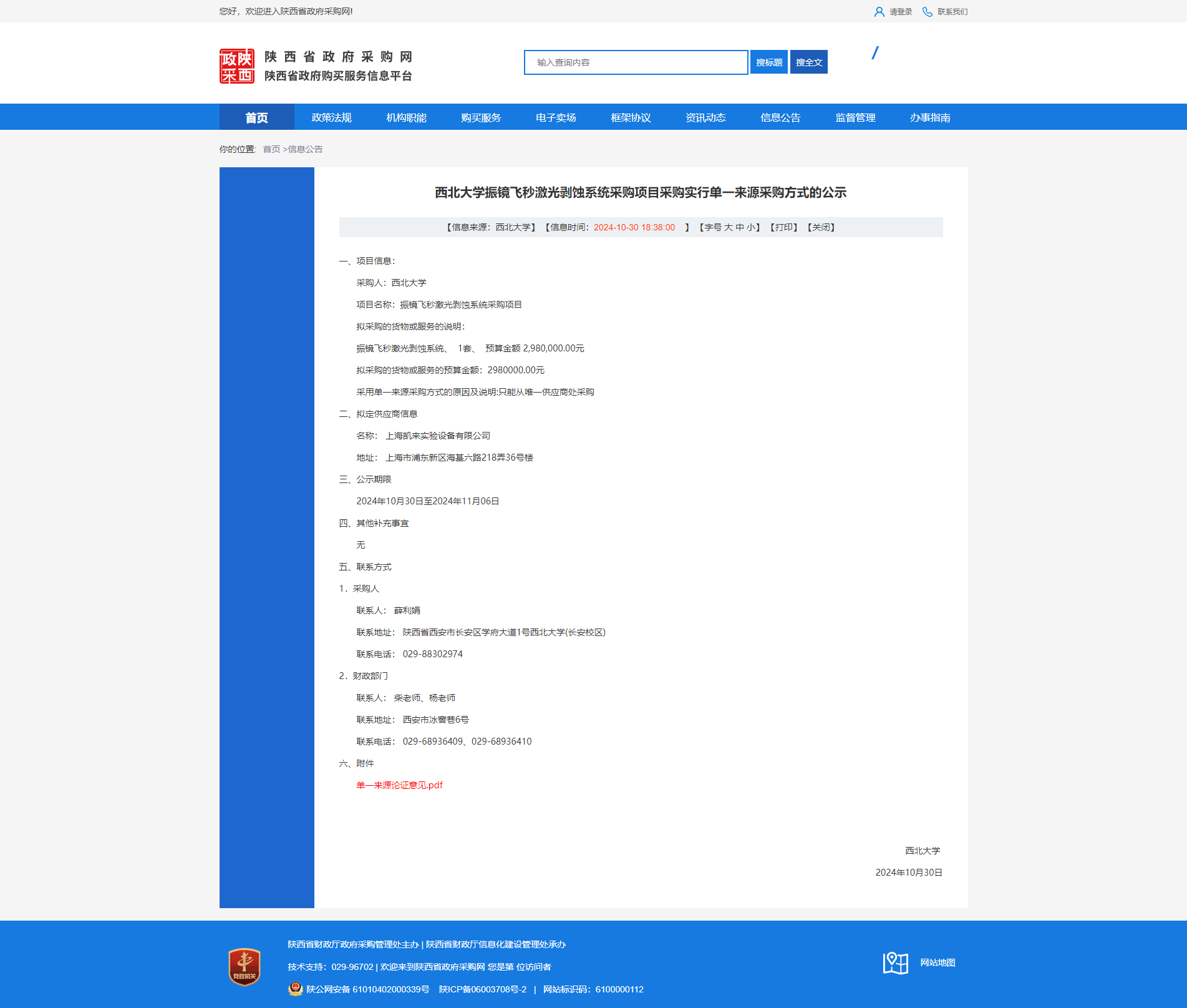 广发体育振镜飞秒激光剥蚀系统采购项目采购实行单一来源采购方式的公示