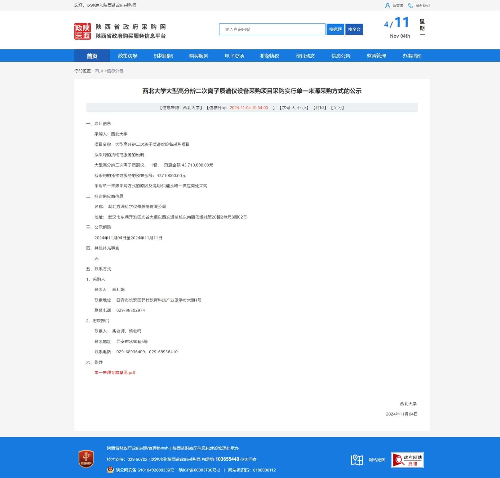 广发体育大型高分辨二次离子质谱仪设备采购项目采购实行单一来源采购方式的公示 作者: 编辑:采购与招标办公室 时间:2024-11-04 原公告链接:https://www.ccgp-shaanxi.gov.cn/freecms/site/shaanxi/ggxx/info/2024/8a69c95c927dd5a50192f6aef7d343e4.html?noticeType=001051¬iceId=3c0a8bad-9aa2-11ef-8063-08c0eb20c666