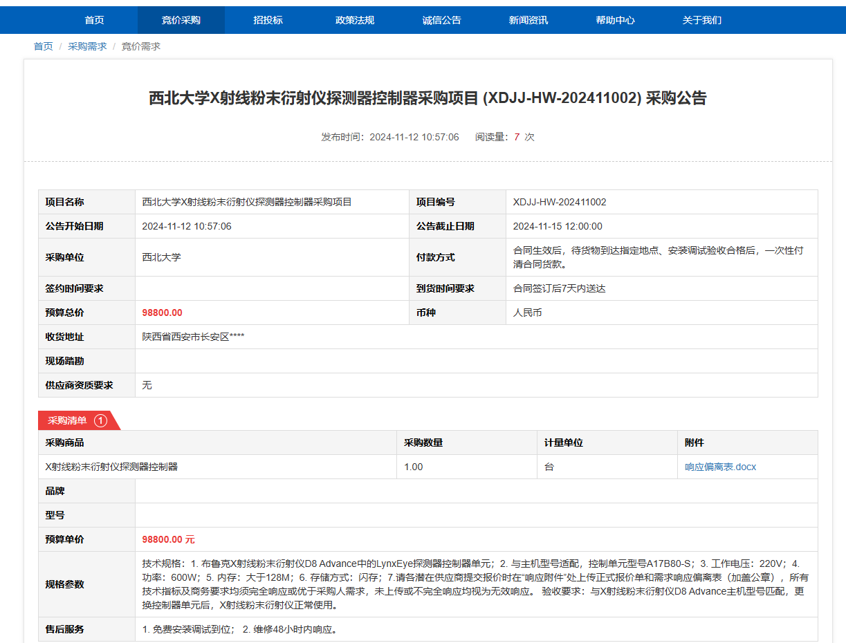 广发体育X射线粉末衍射仪探测器控制器采购项目(XDJJ-HW-202411002)竞价采购公告 作者:采购与招标办公室 编辑: 时间:2024-11-12 原公告链接:https://www.ejingcai.com.cn/site/bidding/detail/14736