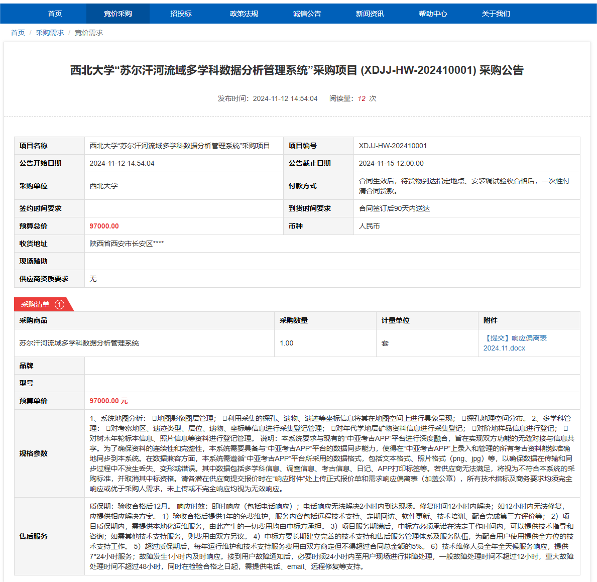 广发体育“苏尔汗河流域多学科数据分析管理系统”采购项目(XDJJ-HW-202410001)竞价采购公告 作者:采购与招标办公室 编辑: 时间:2024-11-12 原公告链接:https://www.ejingcai.com.cn/site/bidding/detail/14753