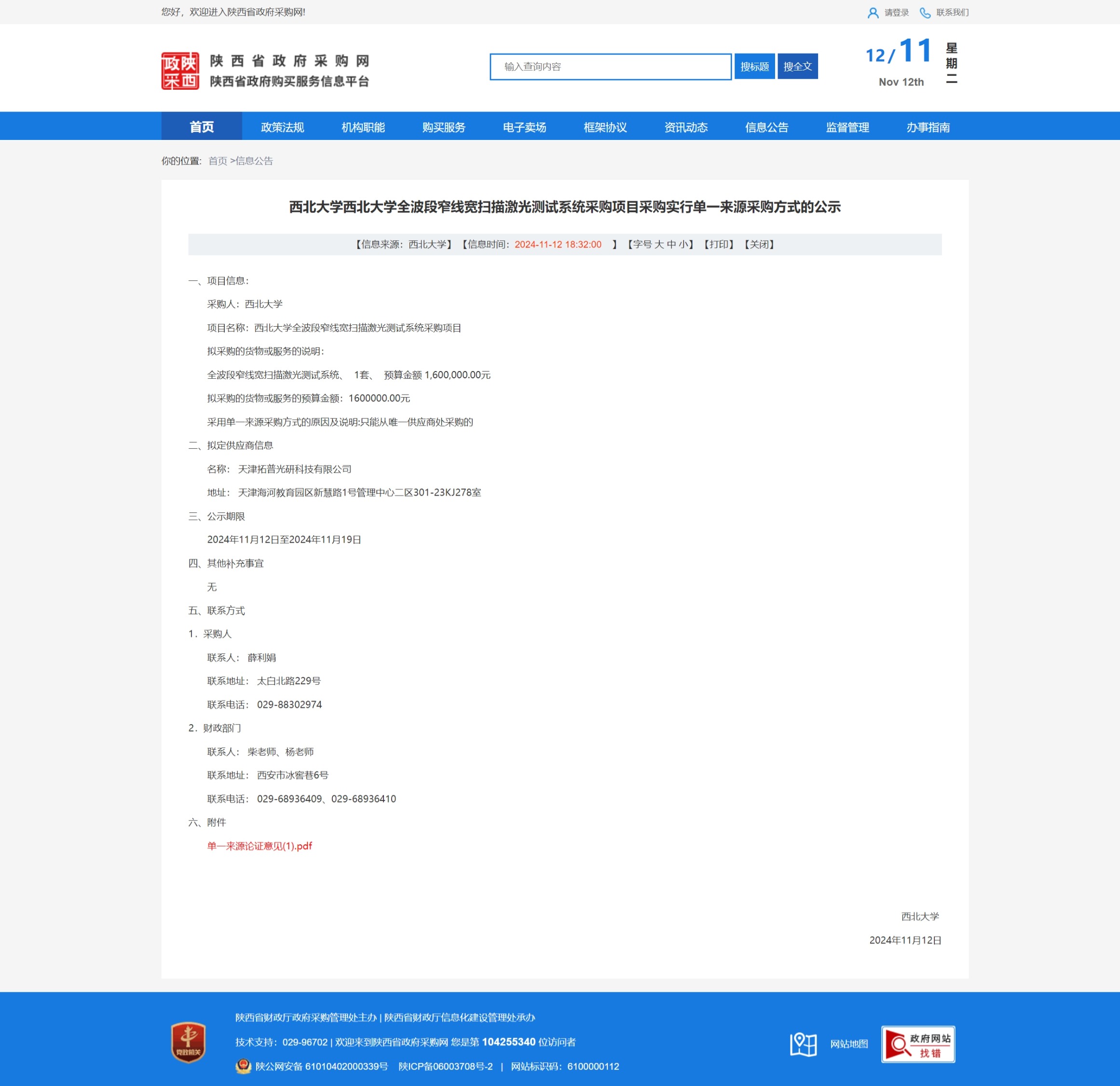 广发体育全波段窄线宽扫描激光测试系统采购项目采购实行单一来源采购方式的公示 作者: 编辑:薛利娟 时间:2024-11-12 原公告链接:https://www.ccgp-shaanxi.gov.cn/freecms/site/shaanxi/ggxx/info/2024/8a69c24d91d6105a01931fd0fd6f6828.html?noticeType=001051¬iceId=e9c41b14-a0e2-11ef-8063-08c0eb20c666