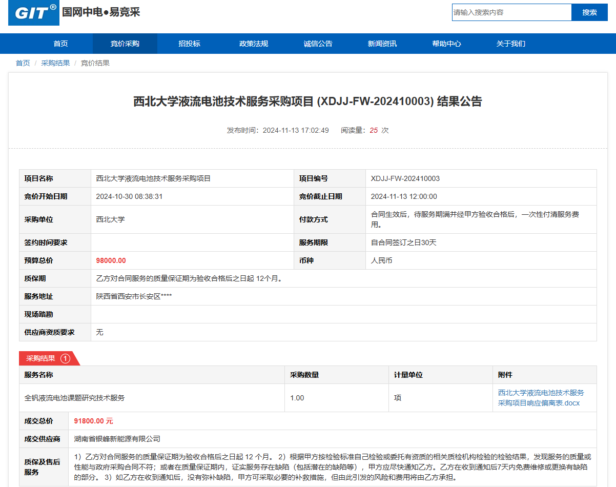 广发体育液流电池技术服务采购项目(XDJJ-FW-202410003)竞价结果公告 作者:采购与招标办公室 编辑: 时间:2024-11-14 原公告链接:https://www.ejingcai.com.cn/site/bidding/detail/14829