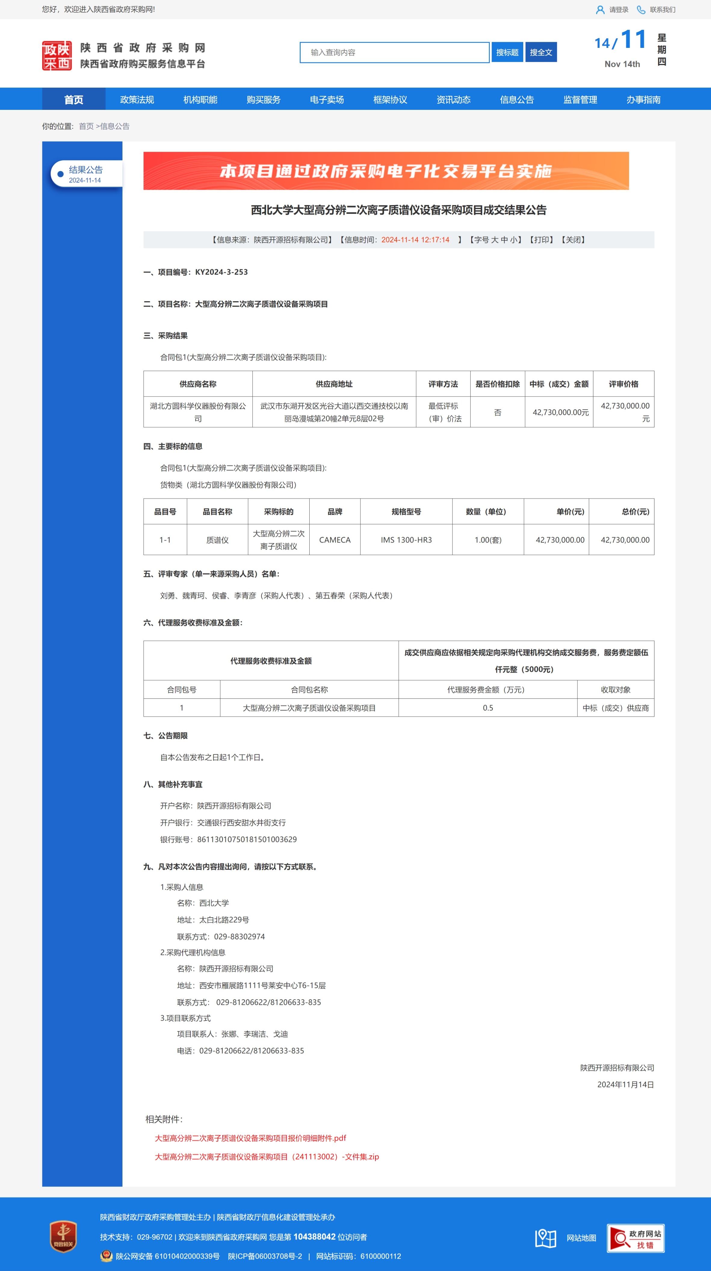 广发体育大型高分辨二次离子质谱仪设备采购项目成交结果公告 作者: 编辑:薛利娟 时间:2024-11-14 原公告链接:https://www.ccgp-shaanxi.gov.cn/freecms/site/shaanxi/ggxx/info/2024/8a69c5a59218576d019328dcd1526537.html?noticeType=001025¬iceId=e4e285ed-a240-11ef-8063-08c0eb20c666