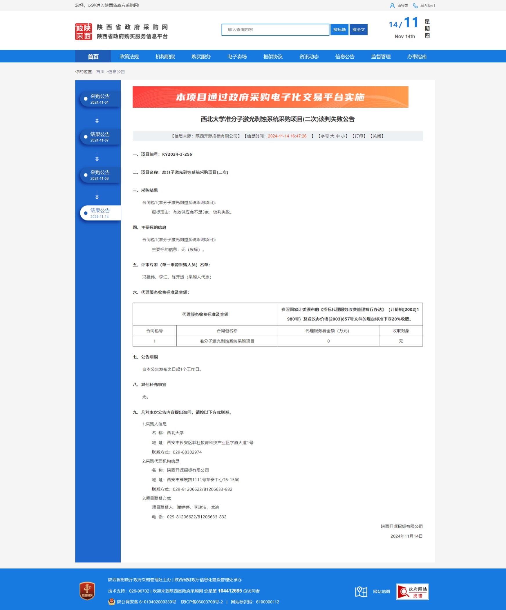 广发体育准分子激光剥蚀系统采购项目(二次)谈判失败公告 作者: 编辑:薛利娟 时间:2024-11-14 原公告链接:https://www.ccgp-shaanxi.gov.cn/freecms/site/shaanxi/ggxx/info/2024/8a69c44e9218572b019329d196666b38.html?noticeType=001006¬iceId=a4a84f2c-a266-11ef-8063-08c0eb20c666