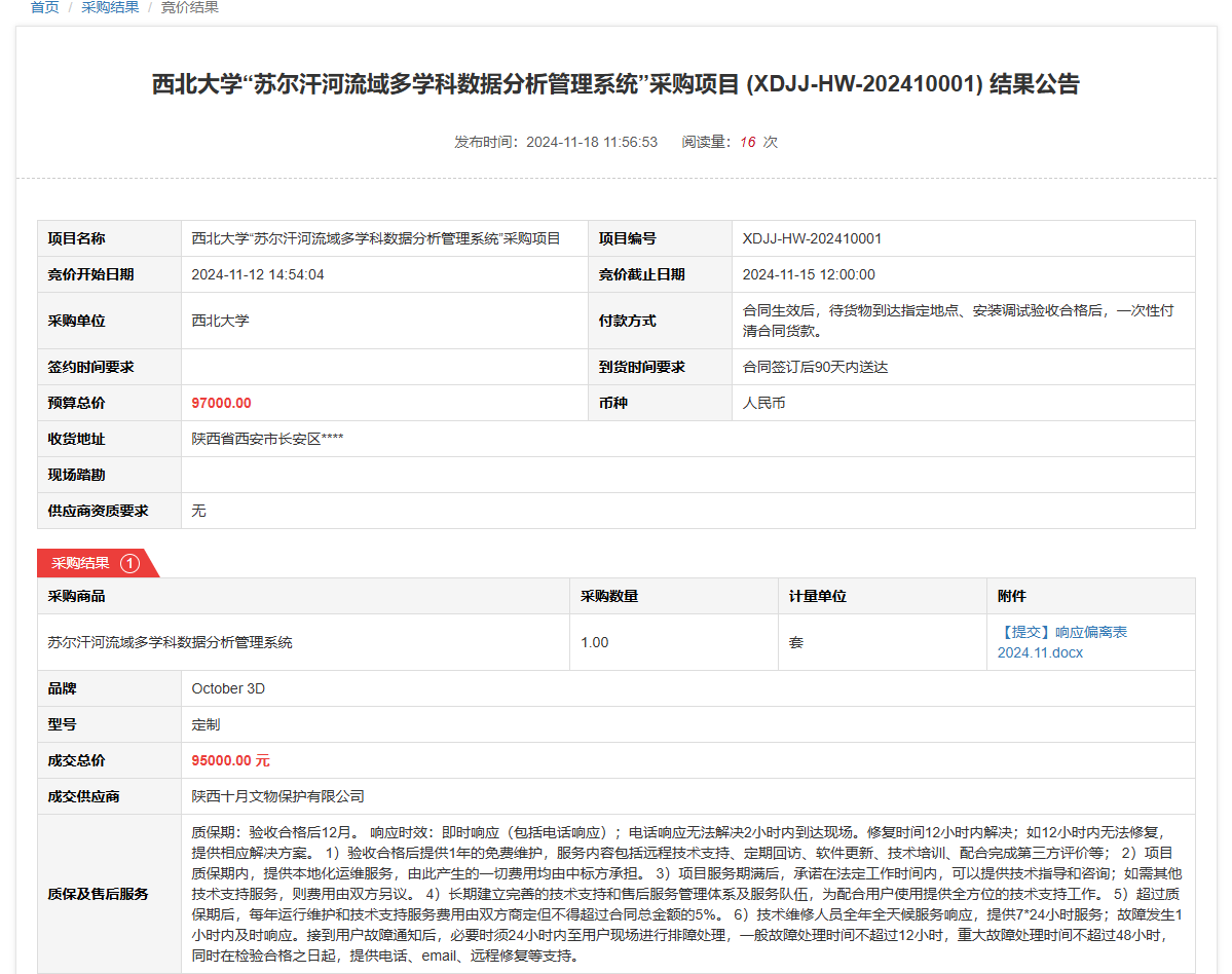 广发体育“苏尔汗河流域多学科数据分析管理系统”采购项目(XDJJ-HW-202410001)竞价结果公告 作者:采购与招标办公室 编辑: 时间:2024-11-18 原公告链接:https://www.ejingcai.com.cn/site/bidding/detail/15008