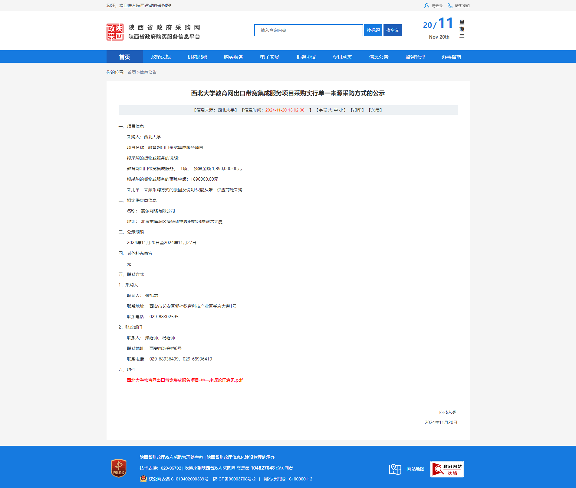 广发体育教育网出口带宽集成服务项目采购实行单一来源采购方式的公示