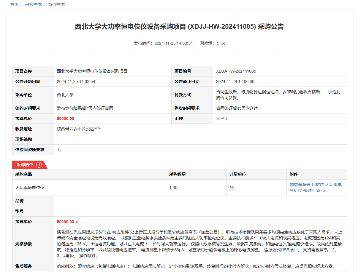 广发体育大功率恒电位仪设备采购项目(XDJJ-HW-202411005)竞价采购公告 作者:采购与招标办公室 编辑: 时间:2024-11-25 原公告链接:https://www.ejingcai.com.cn/site/bidding/detail/15327