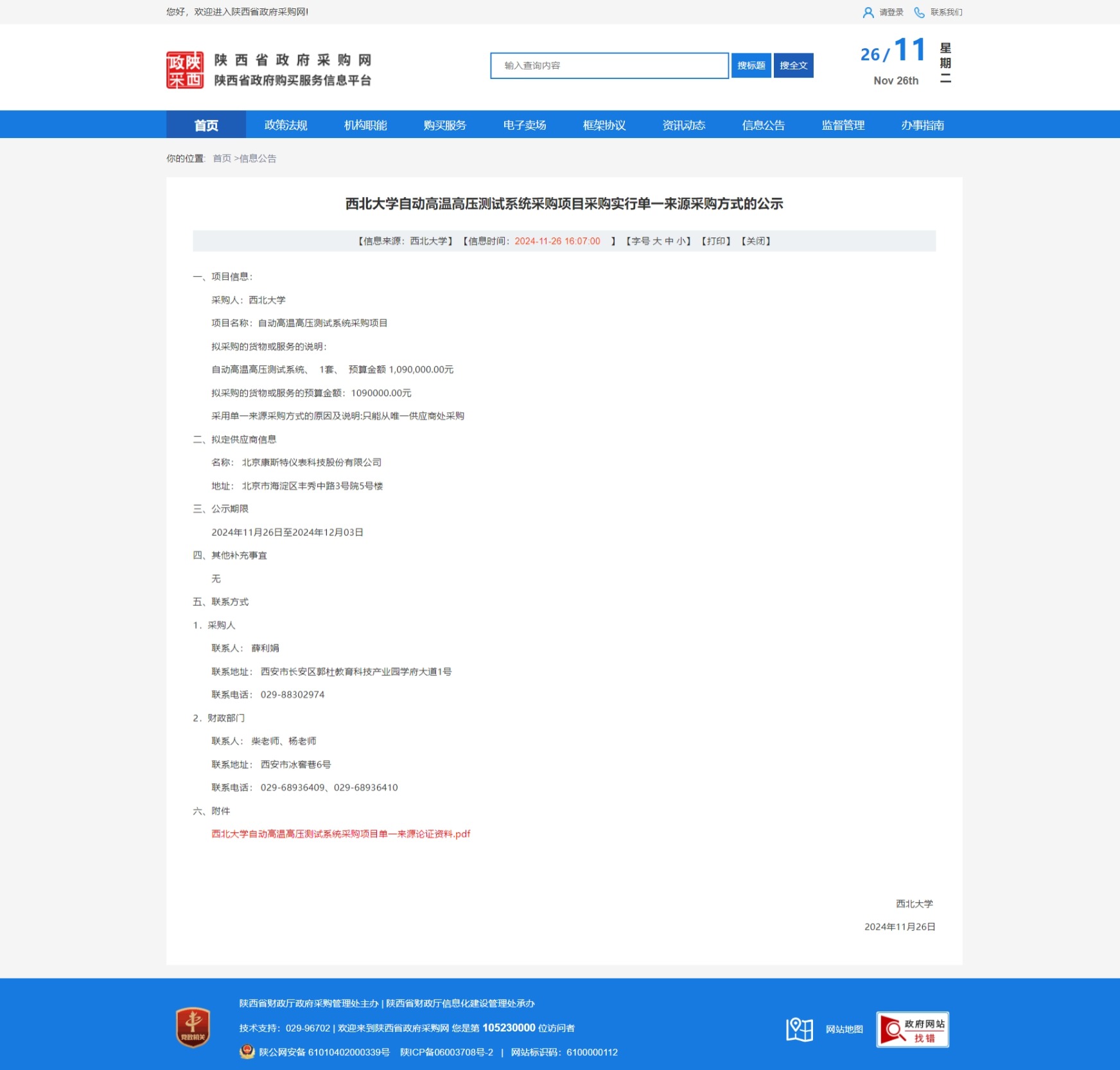 广发体育自动高温高压测试系统采购项目采购实行单一来源采购方式的公示 作者: 编辑:薛利娟 时间:2024-11-26 原公告链接:https://www.ccgp-shaanxi.gov.cn/freecms/site/shaanxi/ggxx/info/2024/8a69c037936597080193677af75243c5.html?noticeType=001051¬iceId=008eb2b0-abcf-11ef-8063-08c0eb20c666