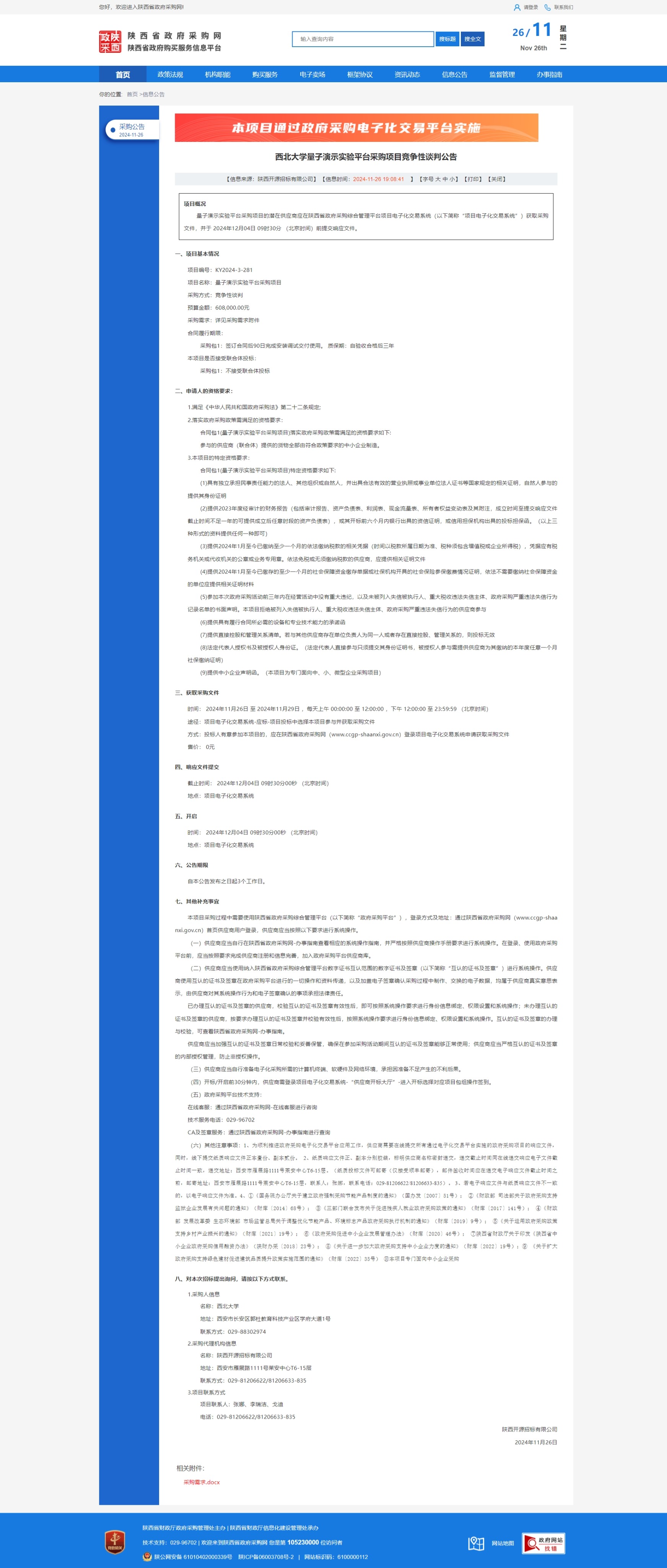 广发体育量子演示实验平台采购项目竞争性谈判公告 作者: 编辑:薛利娟 时间:2024-11-26 原公告链接:https://www.ccgp-shaanxi.gov.cn/freecms/site/shaanxi/ggxx/info/2024/8a69c44e9218572b0193681e9220574d.html?noticeType=001013¬iceId=6276d604-abe8-11ef-8063-08c0eb20c666