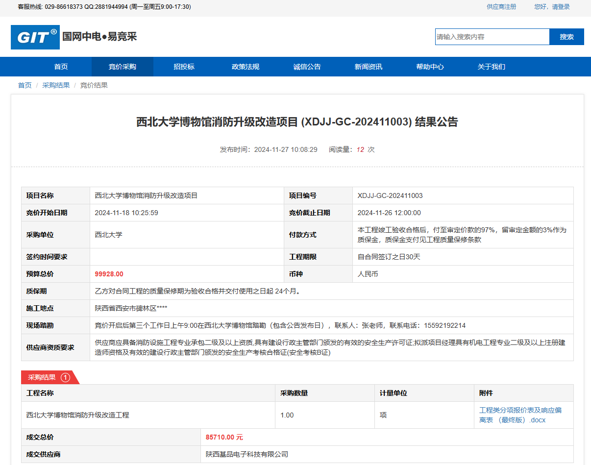 广发体育博物馆消防升级改造项目(XDJJ-GC-202411003)竞价结果公告 作者:采购与招标办公室 编辑: 时间:2024-11-27 原公告链接:https://www.ejingcai.com.cn/site/bidding/detail/15427