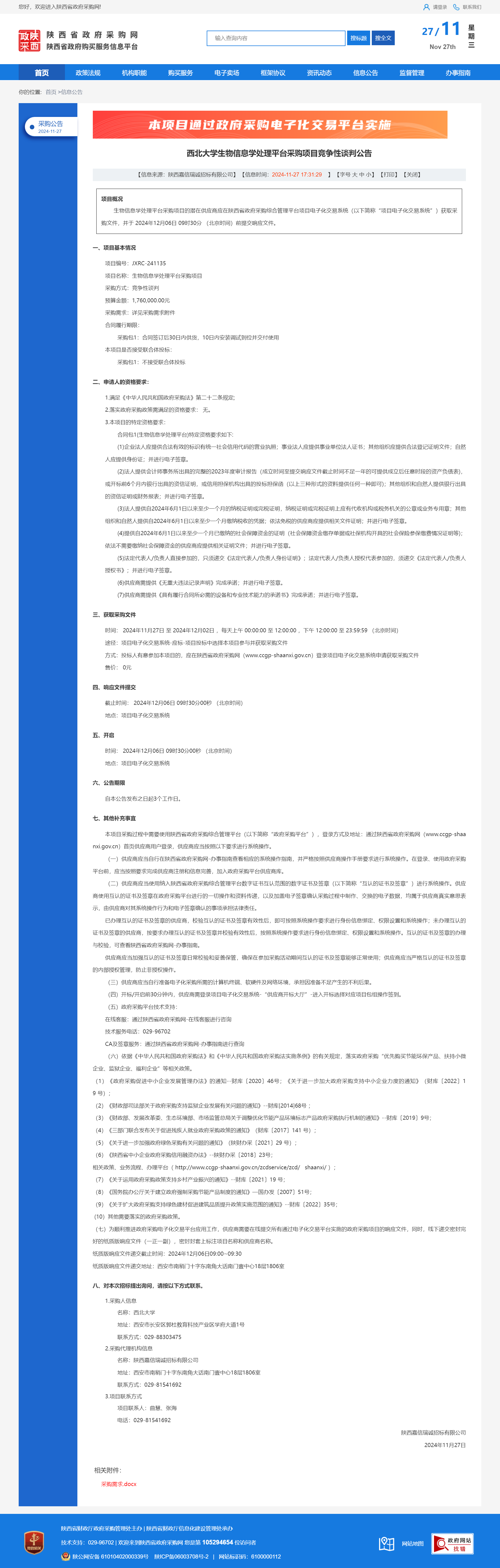 广发体育生物信息学处理平台采购项目竞争性谈判公告 作者:采购与招标办公室 编辑: 时间:2024-11-27 原公告链接:https://www.ccgp-shaanxi.gov.cn/freecms/site/shaanxi/ggxx/info/2024/8a69c2519218573701936ce159174448.html?noticeType=001013¬iceId=f93e2324-aca3-11ef-8063-08c0eb20c666