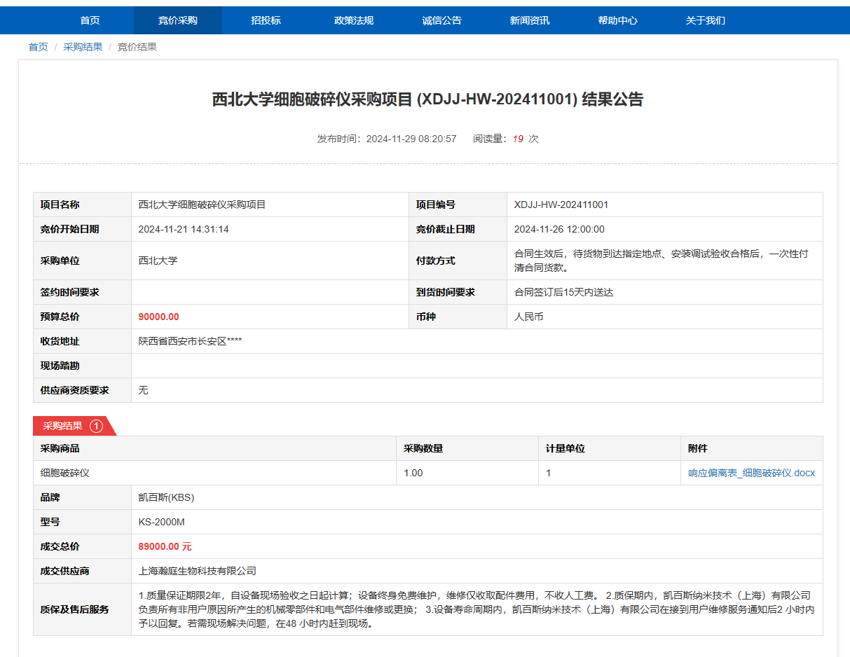 广发体育细胞破碎仪采购项目(XDJJ-HW-202411001)竞价结果公告 作者:采购与招标办公室 编辑: 时间:2024-11-29 原公告链接:https://www.ejingcai.com.cn/site/bidding/detail/15477
