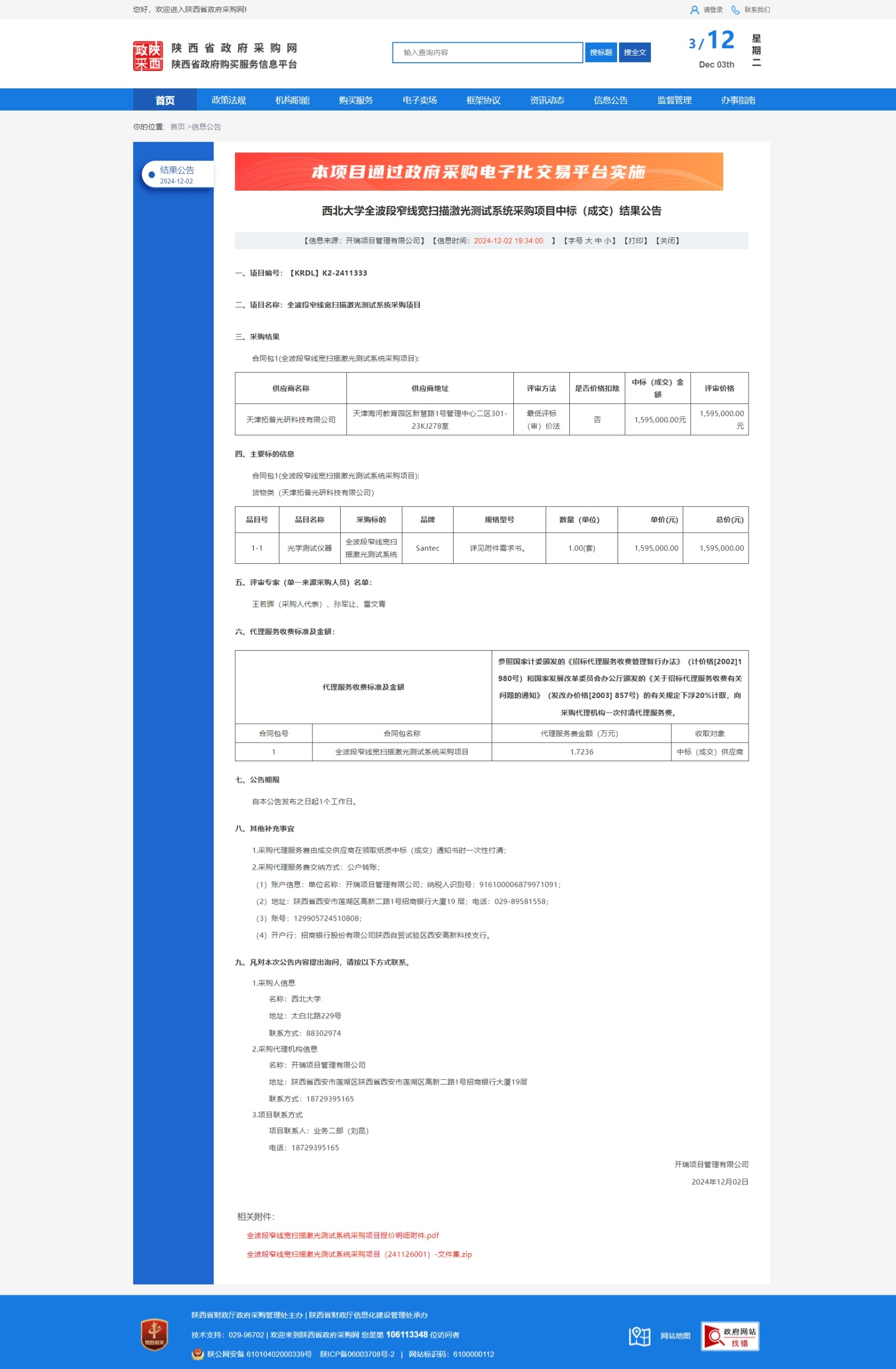 广发体育全波段窄线宽扫描激光测试系统采购项目中标(成交)结果公告 作者: 编辑:薛利娟 时间:2024-12-03 原公告链接:https://www.ccgp-shaanxi.gov.cn/freecms/site/shaanxi/ggxx/info/2024/8a69c25192185737019387129cff6e5b.html?noticeType=001025¬iceId=ed669128-b0a2-11ef-8063-08c0eb20c666
