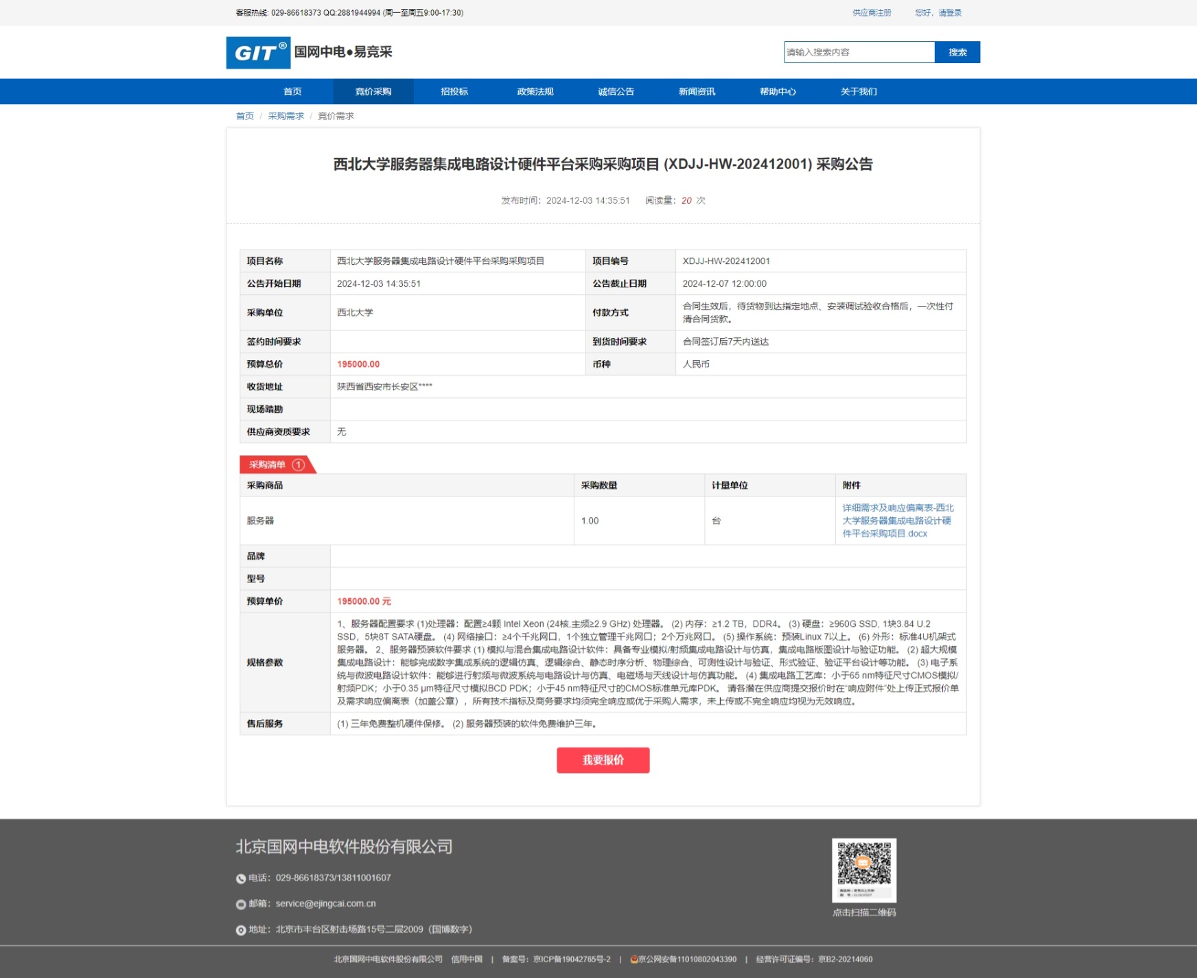 广发体育服务器集成电路设计硬件平台采购采购项目 (XDJJ-HW-202412001) 竞价采购公告 作者: 编辑:薛利娟 时间:2024-12-03 原公告链接:https://www.ejingcai.com.cn/site/bidding/detail/15610