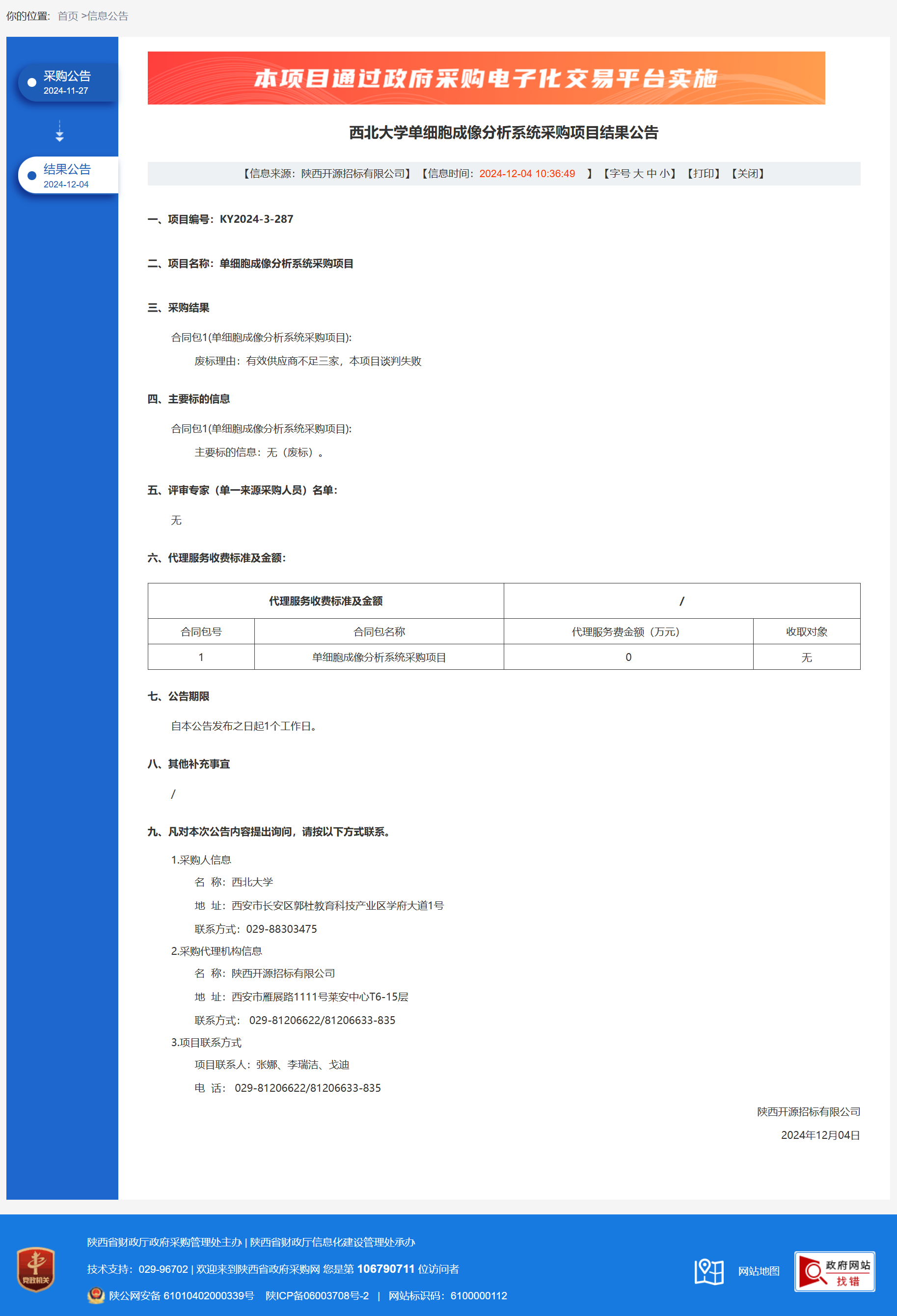 广发体育单细胞成像分析系统采购项目结果公告 作者:采购与招标办公室 编辑: 时间:2024-12-04 原公告链接:https://www.ccgp-shaanxi.gov.cn/freecms/site/shaanxi/ggxx/info/2024/8a69c2519218573701938f5b22ae4a5a.html?noticeType=001006¬iceId=379ded18-b1ea-11ef-8063-08c0eb20c666