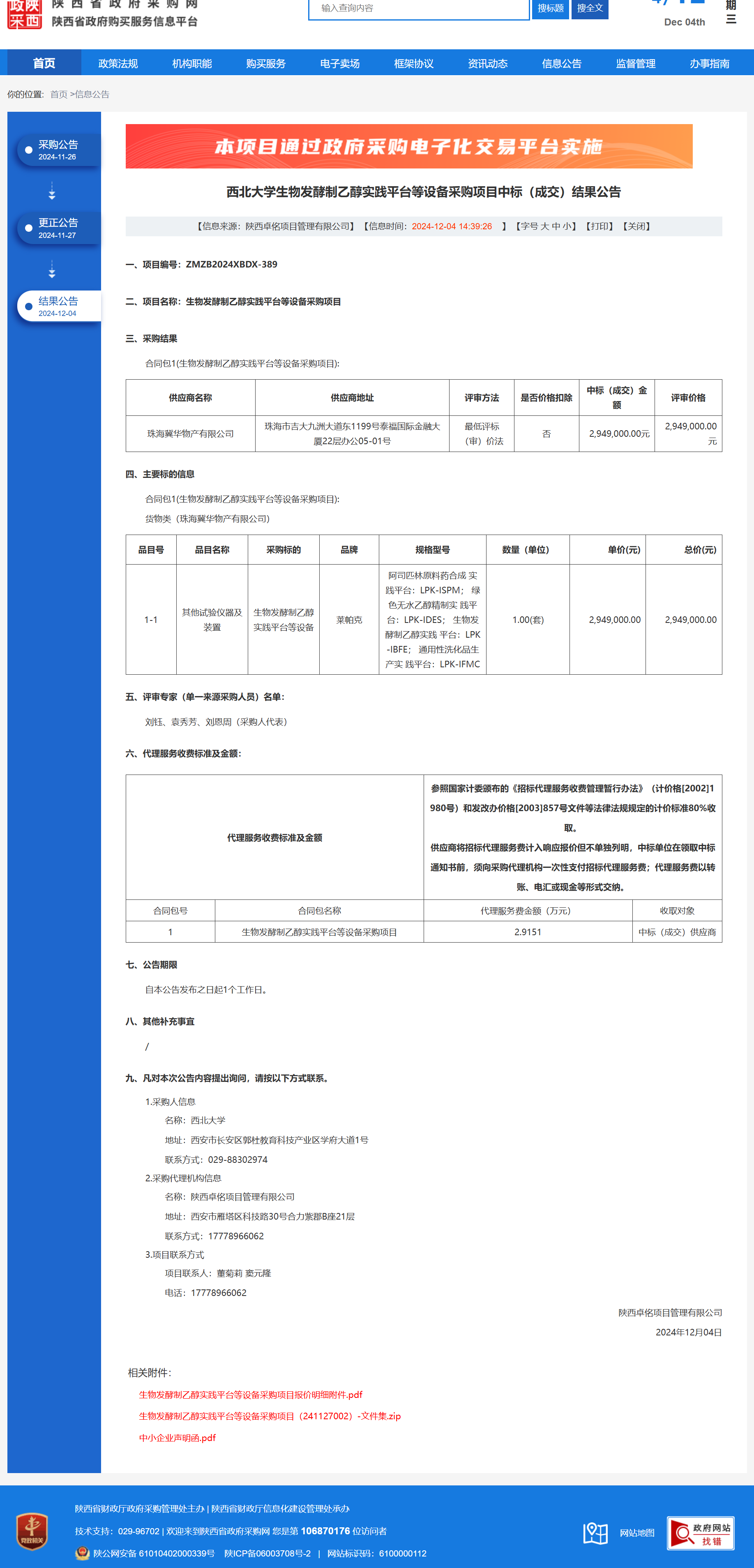 广发体育生物发酵制乙醇实践平台等设备采购项目中标(成交)结果公告 作者:采购与招标办公室 编辑: 时间:2024-12-04 原公告链接:https://www.ccgp-shaanxi.gov.cn/freecms/site/shaanxi/ggxx/info/2024/8a69c5a59218576d0193905cb113521a.html?noticeType=001023¬iceId=1cad3dce-b20c-11ef-8063-08c0eb20c666