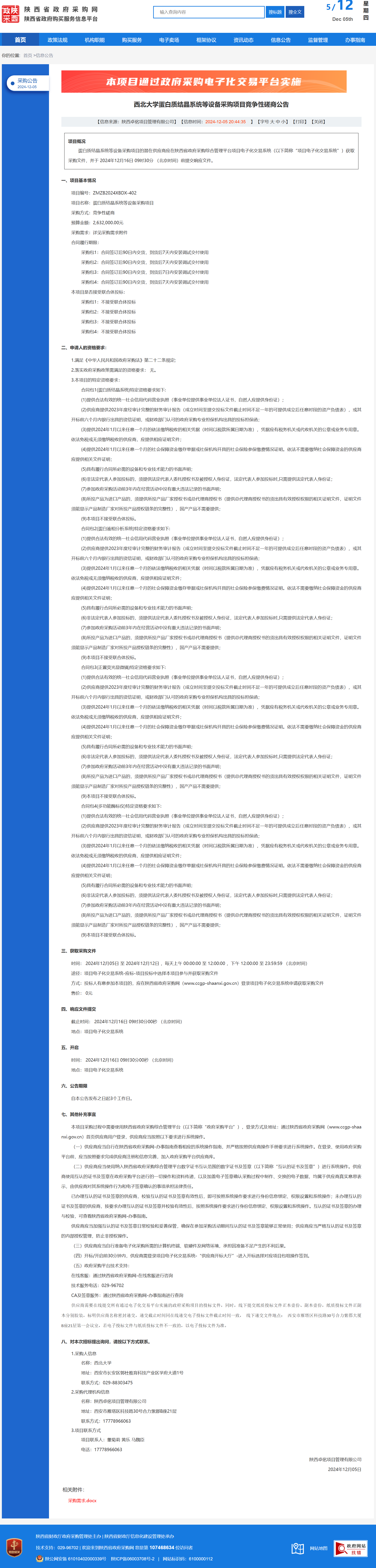 广发体育蛋白质结晶系统等设备采购项目竞争性磋商公告 作者:采购与招标办公室 编辑: 时间:2024-12-05 原公告链接:https://www.ccgp-shaanxi.gov.cn/freecms/site/shaanxi/ggxx/info/2024/8a69c5a59218576d019396cdb04e04be.html?noticeType=001016¬iceId=4a7b03e9-b308-11ef-8063-08c0eb20c666