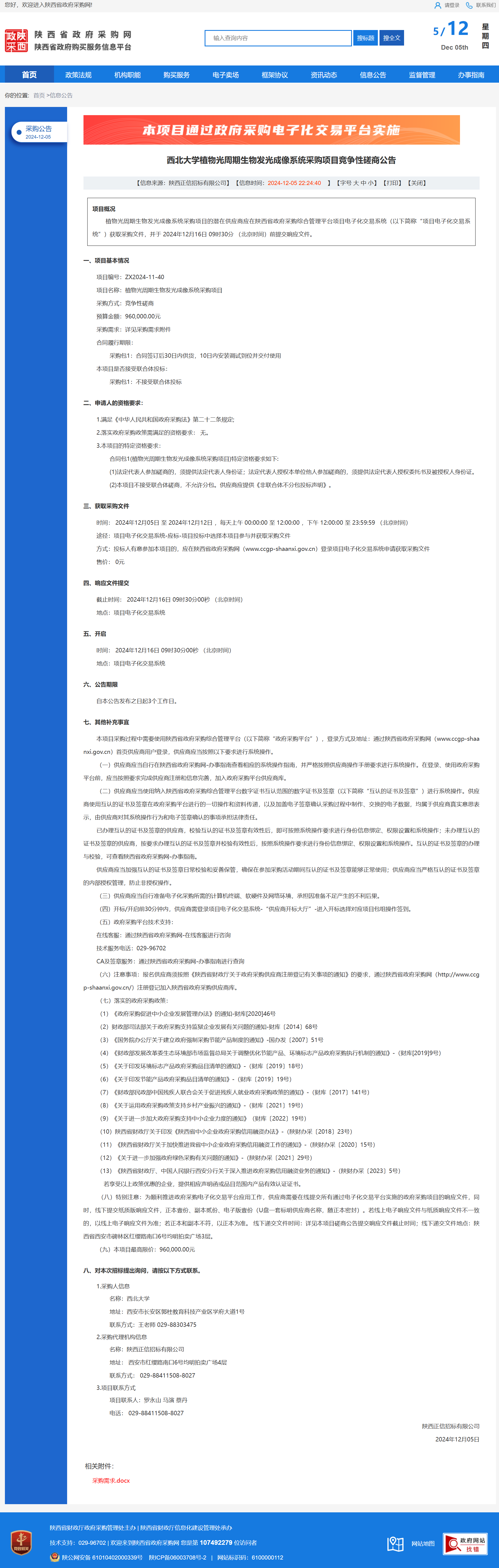 广发体育植物光周期生物发光成像系统采购项目竞争性磋商公告 作者:采购与招标办公室 编辑: 时间:2024-12-05 原公告链接:https://www.ccgp-shaanxi.gov.cn/freecms/site/shaanxi/ggxx/info/2024/8a69c95d921859f001939727d0c77226.html?noticeType=001016¬iceId=4561f1ca-b316-11ef-8063-08c0eb20c666