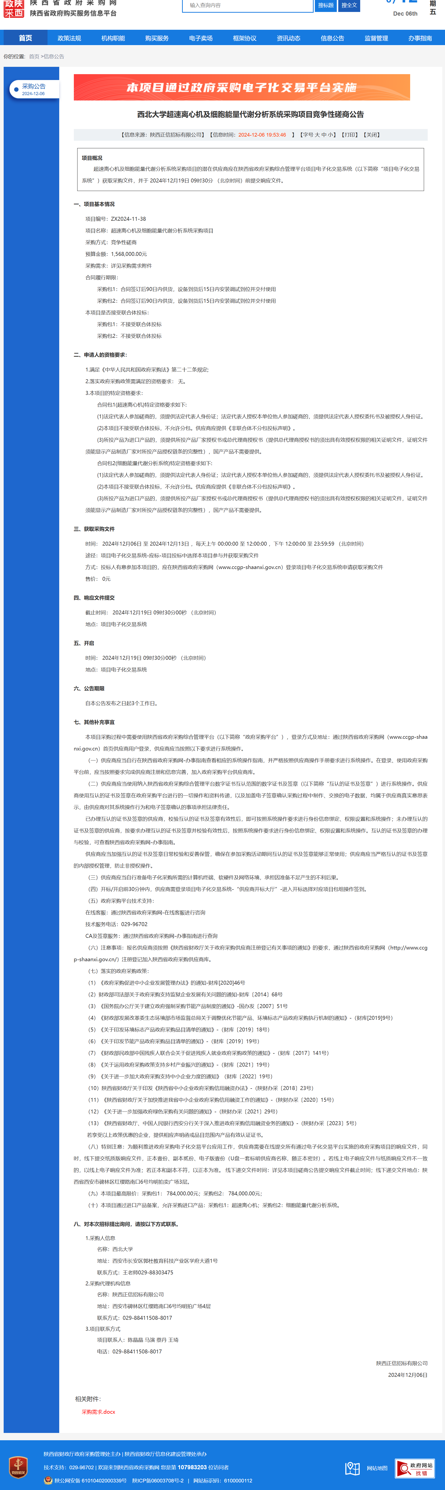 广发体育超速离心机及细胞能量代谢分析系统采购项目竞争性磋商公告 作者:采购与招标办公室 编辑: 时间:2024-12-06 原公告链接:https://www.ccgp-shaanxi.gov.cn/freecms/site/shaanxi/ggxx/info/2024/8a69c5a59218576d01939bb6350f3f92.html?noticeType=001016¬iceId=5be8bcca-b3ca-11ef-8063-08c0eb20c666