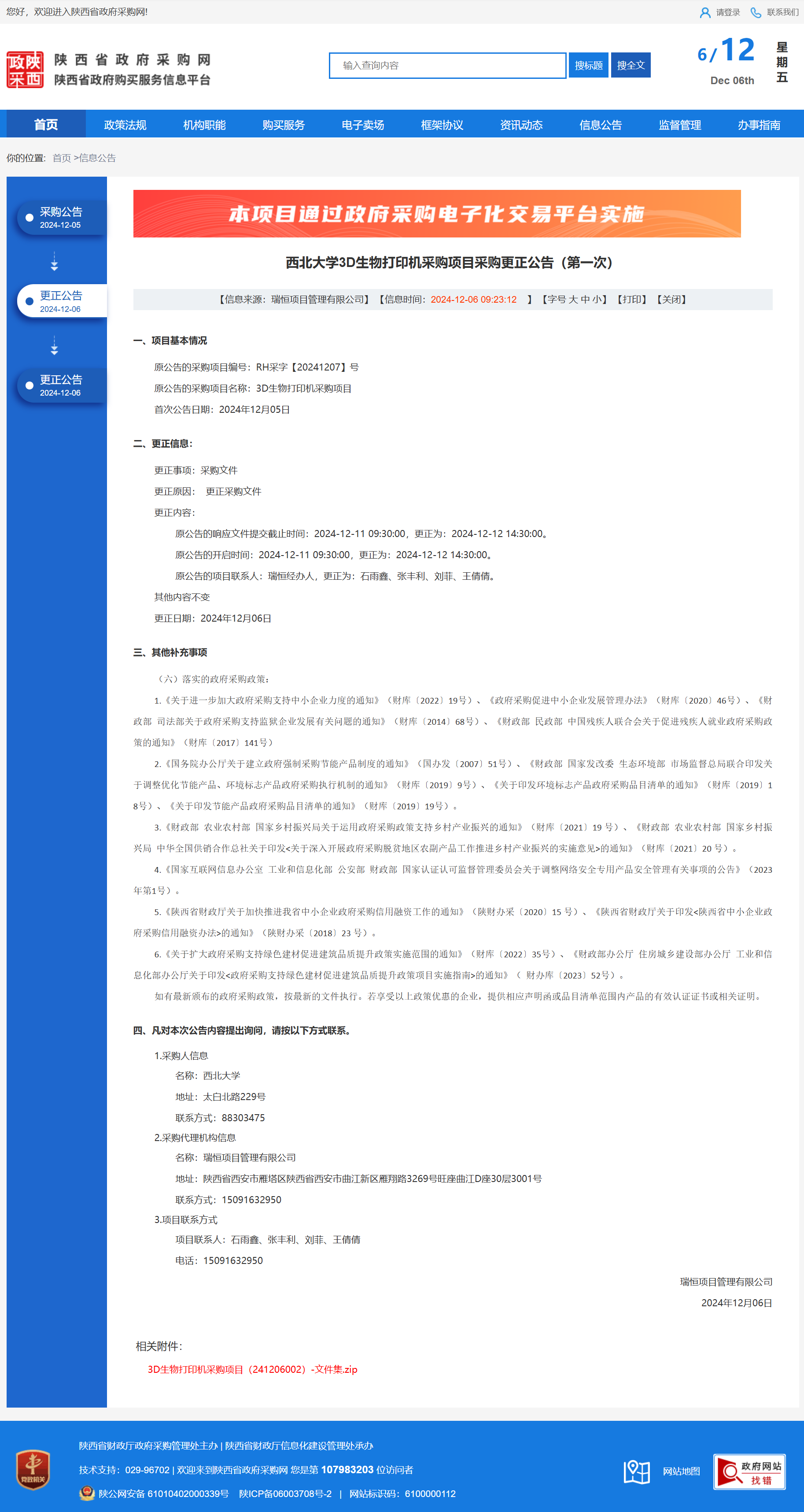 广发体育3D生物打印机采购项目采购更正公告(第一次) 作者:采购与招标办公室 编辑: 时间:2024-12-06 原公告链接:https://www.ccgp-shaanxi.gov.cn/freecms/site/shaanxi/ggxx/info/2024/8a69c5a59218576d01939986cdf22d19.html?noticeType=001031¬iceId=448cc335-b372-11ef-8063-08c0eb20c666