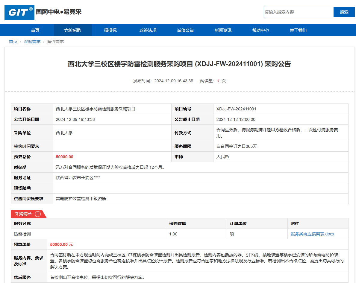 广发体育三校区楼宇防雷检测服务采购项目(XDJJ-FW-202411001)采购公告 作者:采购与招标办公室 编辑: 时间:2024-12-09 原公告链接:https://www.ejingcai.com.cn/site/bidding/detail/15824