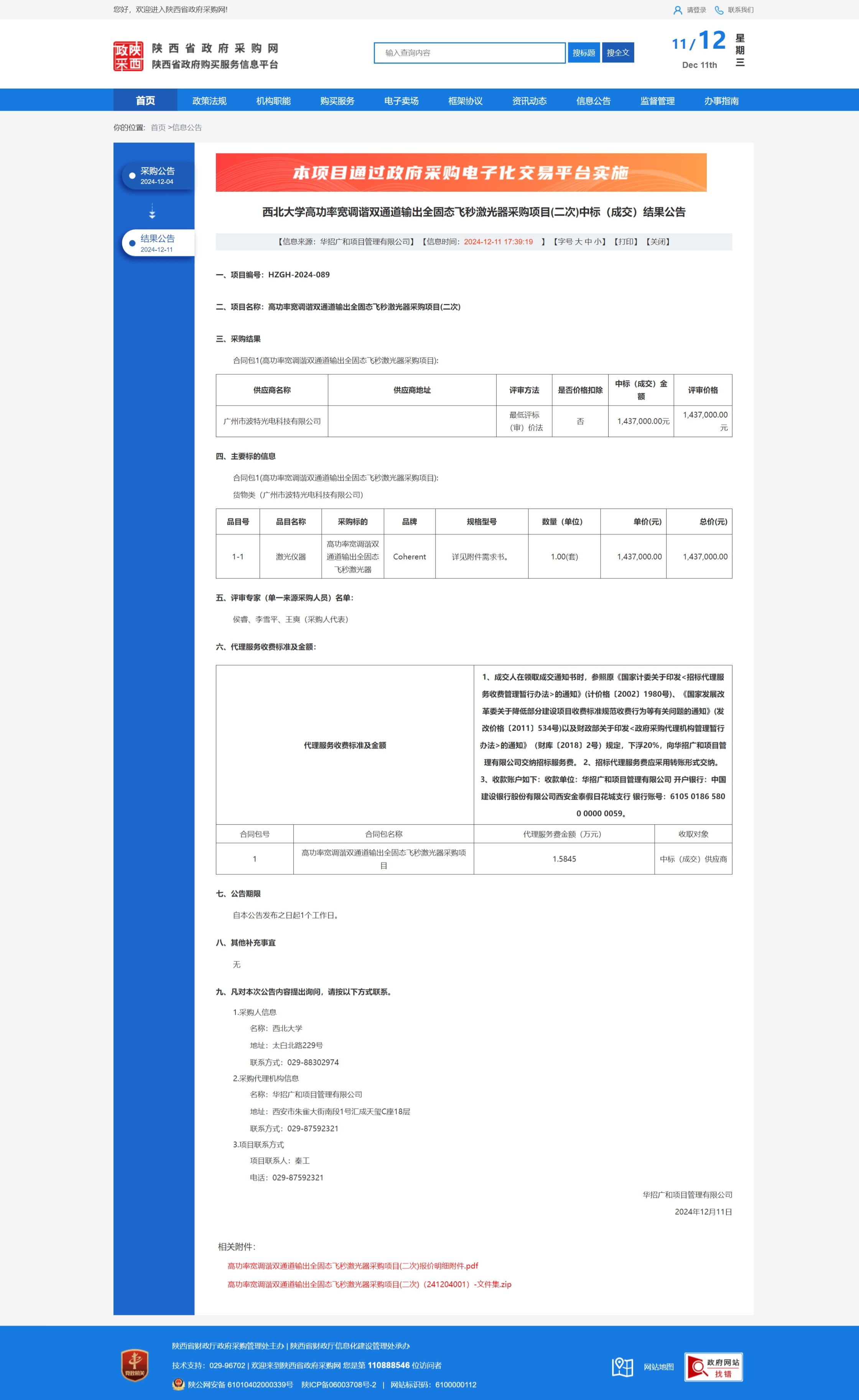 广发体育高功率宽调谐双通道输出全固态飞秒激光器采购项目(二次)中标(成交)结果公告 作者: 编辑:薛利娟 时间:2024-12-11 原公告链接:https://www.ccgp-shaanxi.gov.cn/freecms/site/shaanxi/ggxx/info/2024/8a69c44e9218572b0193b510703434f1.html?noticeType=001023¬iceId=6a16952d-b7a5-11ef-8063-08c0eb20c666