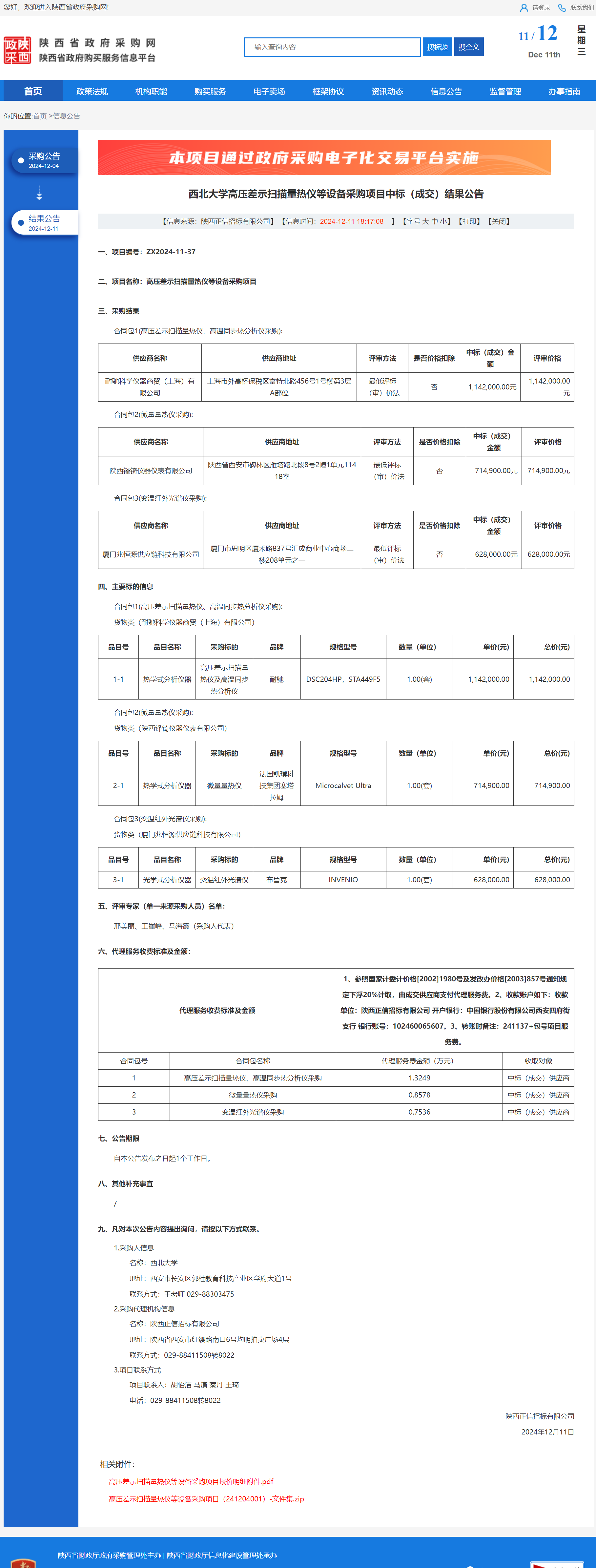 广发体育高压差示扫描量热仪等设备采购项目中标(成交)结果公告 作者:采购与招标办公室 编辑: 时间:2024-12-11 原公告链接:https://www.ccgp-shaanxi.gov.cn/freecms/site/shaanxi/ggxx/info/2024/8a69c44e9218572b0193b4b4345f2fdb.html?noticeType=001023¬iceId=b2939b12-b7aa-11ef-8063-08c0eb20c666
