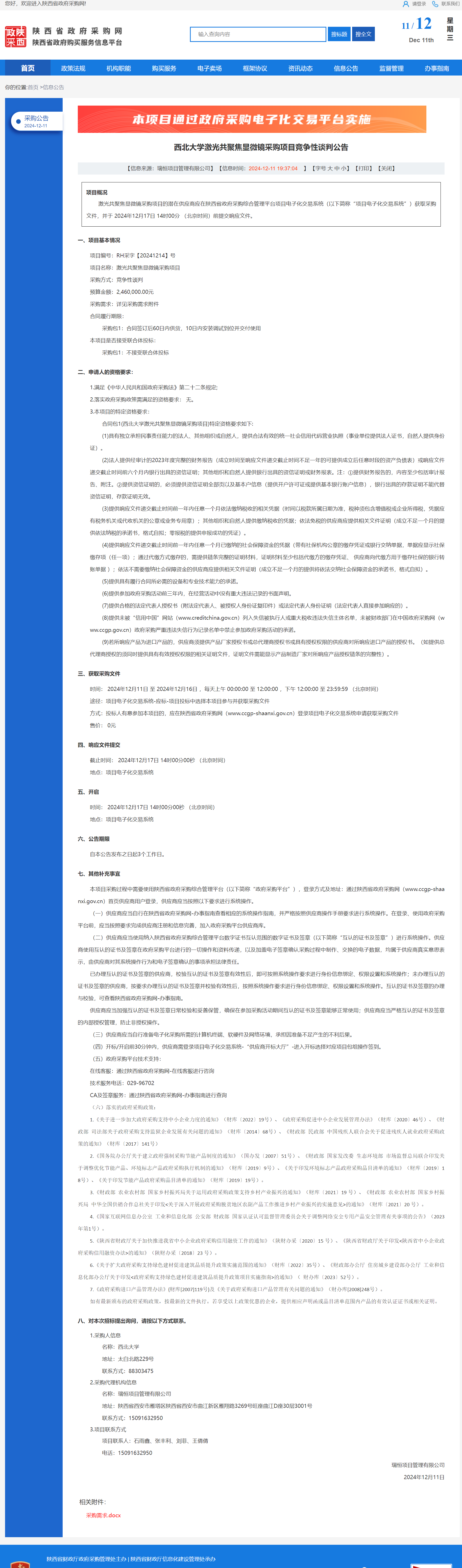 广发体育激光共聚焦显微镜采购项目竞争性谈判公告 作者:采购与招标办公室 编辑: 时间:2024-12-11 原公告链接:http://www.ccgp-shaanxi.gov.cn/freecms/site/shaanxi/ggxx/info/2024/8a69c251921857370193b57bb88b7b39.html?noticeType=001013¬iceId=dd50ecdc-b7b5-11ef-8063-08c0eb20c666