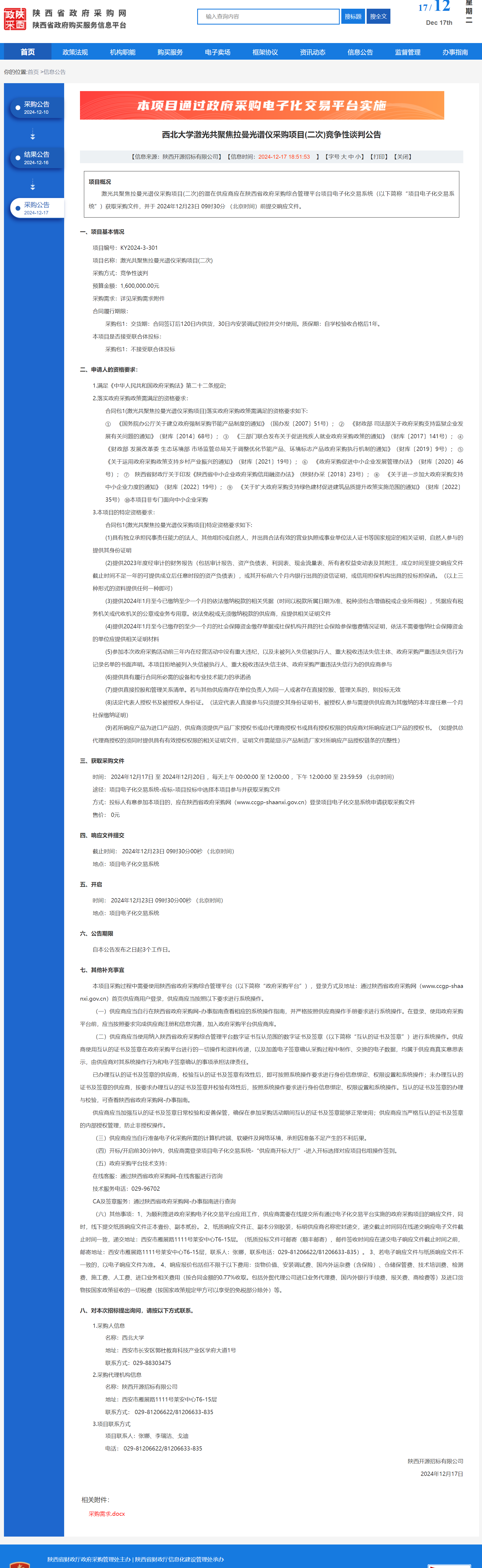 原公告链接:https://www.ccgp-shaanxi.gov.cn/freecms/site/shaanxi/ggxx/info/2024/8a69c44e9218572b0193d434f6c730a9.html?noticeType=001013&noticeId=8ed4237e-bc66-11ef-8063-08c0eb20c666