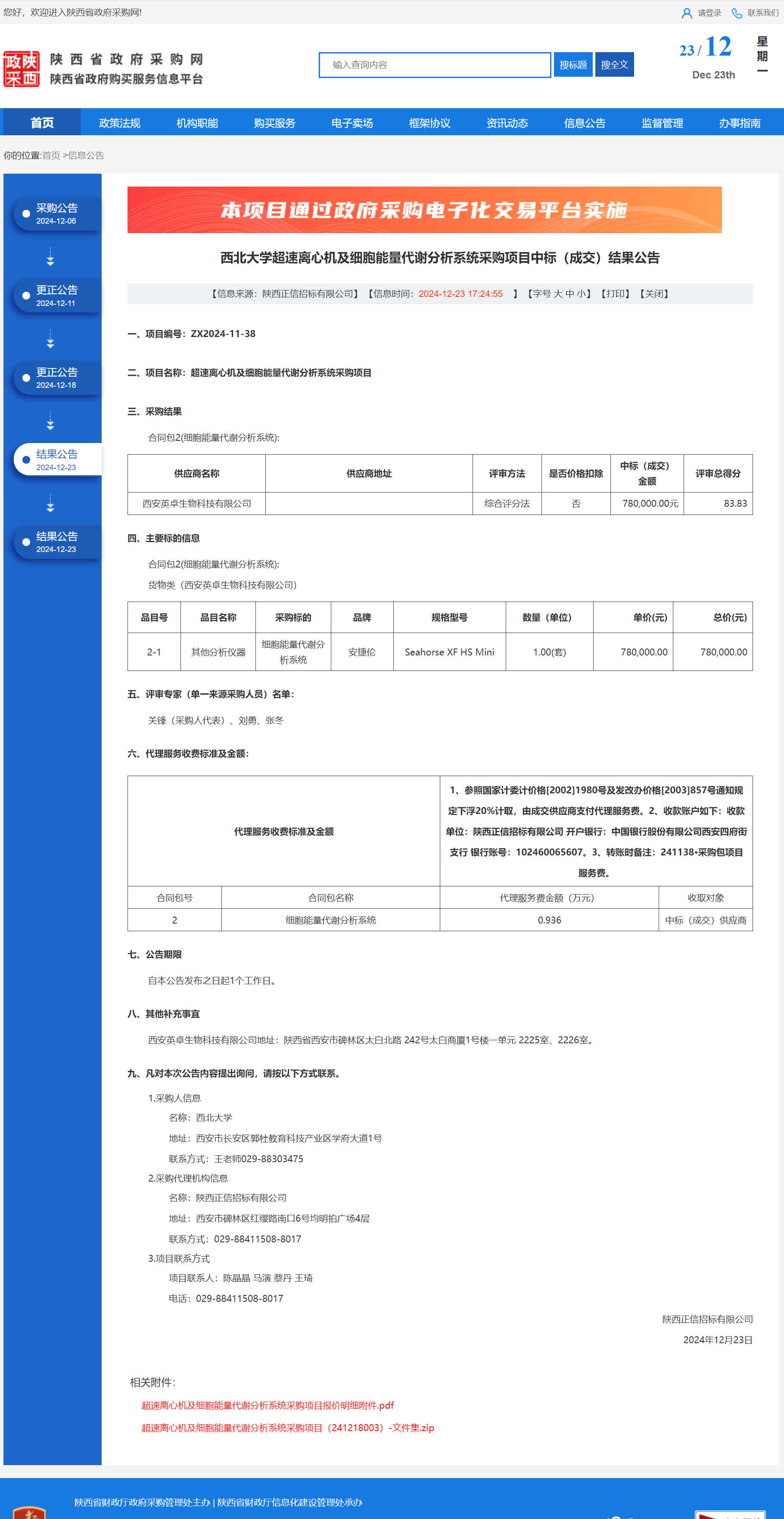 广发体育超速离心机及细胞能量代谢分析系统采购项目结果公告