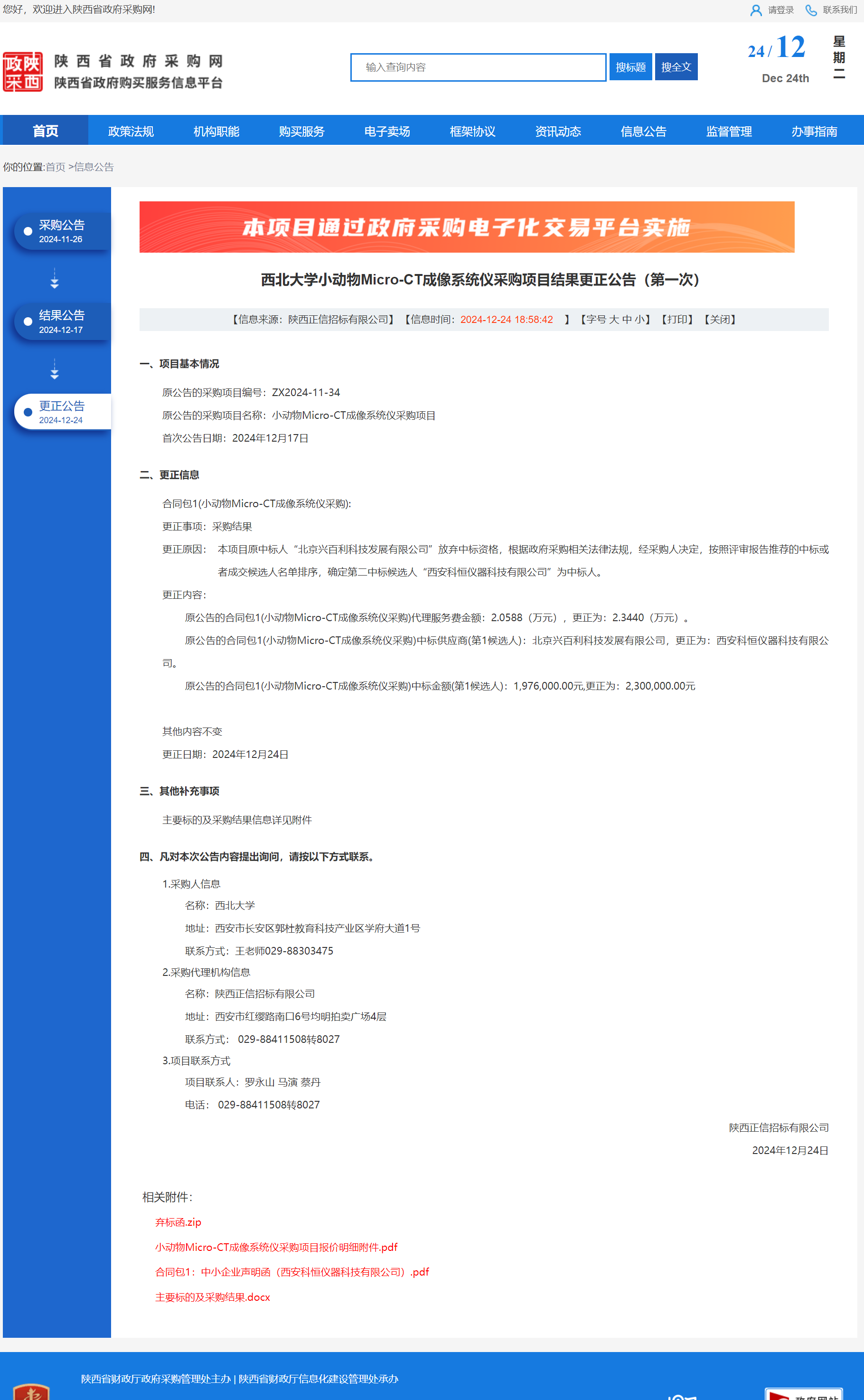 广发体育小动物Micro-CT成像系统仪采购项目结果更正公告(第一次)